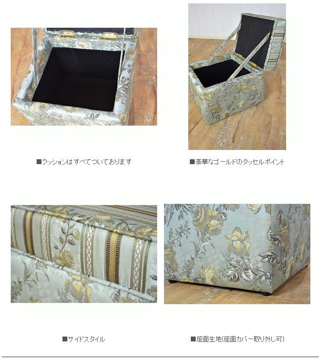 名前の通り、ヨーロッパスタイルのオットマン。こちら、すぐに完売してしまいがちの人気の光沢あるグリーンカラーとなります。 落ち着いた雰囲気と華やかさを兼ね揃え、また汚れも目立ちにくいことから大変人気をいただいているお色味となります。 座った感じはフィット感があり、スツールとして座っていても疲れにくい適度なやわらかさです。また、こちらの商品、中は収納スペースとなっていて一石二鳥!お部屋のアクセントや、ゲストルーム、サロンにとメインルームに最適です。 海外直接買付けだから、嬉しいリーズナブルプライスです。※【必ずお読みください】こちらの商品は主に輸入家具となっており、海外での生産となります。また、ヨーロッパ・ドバイ・アメリカなどといった海外向けに作られている商品となります。ほとんどが手作り・手塗装で制作されております。一点一点が手作業のため、塗装・仕上がりには個体差がございます。弊社での検品を行い、修正できる部分は修正してからの発送をしておりますが、アンティーク塗装仕上げ(離れると見えない程度)となっている個所がございますこと、予めご理解・ご了承の上、お買い求めください。