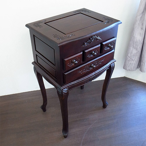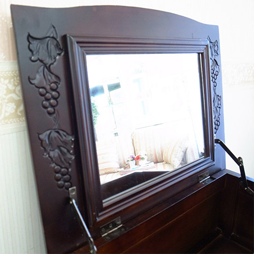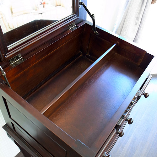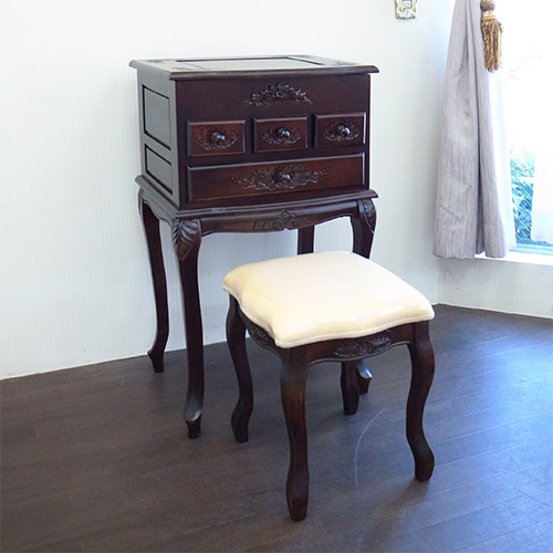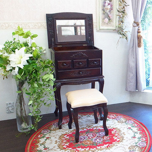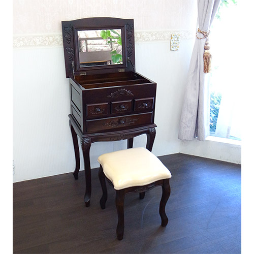 綺麗な猫脚と手彫りの彫刻が美しい、栃家具シリーズのドレッサーセットです。 自分磨きに欠かせないドレッサー置きたいけど、スペースが…と諦めていた方も多いのでは?こちらは幅もあまりなく、それでいて収納力たっぷりの機能的なドレッサーとなります。 普段はチェストのようにしておいて、使うときに天板を開けばミラーが出てくるので、インテリア性も損ないません。 スツールも付いてきますので、届いたその日からすぐにお使いいただけます。 毎日の自分磨きを、充実した時間へ…。 ※天板・引き出し内部は塗装の臭いが幾分か致します。※こちらの商品は日本製と比べてアジア家具特有の多少アバウトな作りになっております。その点をご了承の上、ご購入ください。※【必ずお読みください】こちらの商品は主に輸入家具となっており、海外での生産となります。また、ヨーロッパ・ドバイ・アメリカなどといった海外向けに作られている商品となります。ほとんどが手作り・手塗装で制作されております。一点一点が手作業のため、塗装・仕上がりには個体差がございます。弊社での検品を行い、修正できる部分は修正してからの発送をしておりますが、アンティーク塗装仕上げ(離れると見えない程度)となっている個所がございますこと、予めご理解・ご了承の上、お買い求めください。