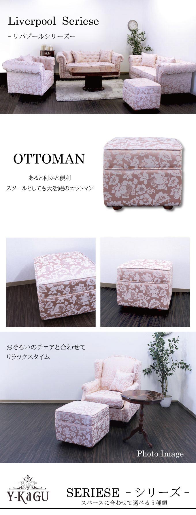 上品なピンクが大人のロマンティックさを誘うリバプールシリーズの新作ピンクカラーのオットマンです。ソファと一緒にご利用ください♪