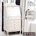 上段の棚板を開くとデスクになる省スペースで使える便利なライティングデスク。扉を開いた時に天板(机面)が安定するように支柱も一緒に出てくるので安定感もばっちり。収納とデスクとが1つになっているので、場所もとらないところが嬉しいポイント。 上品さと可愛らしさを兼ねそろえているヴィオレッテルシリーズ。浮き彫りと猫脚などヨーロピアンティストのエレガントさをお楽しみください。