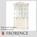 曲線に光沢感のある質感が豪華で美しい、3ドアキャビネットです。光沢感あるゴールドの金具部分にはクリスタルが付いています。ガラス扉内部の背面は鏡で、上部にはライトが2つ付いています。コンセント部分に照明スイッチが付いていいて、点けたり消したりできます。 夜には照明がわりにもなりますね。3面とも開けるのでコレクションや食器の入れ替えがスムーズに出来ます。下の部分は収納スペースになり便利ですよ! 優雅で気品のあるフローレンスシリーズ。優しいアイボリーの気品ある美しさにゴールドのアクセントが高級感を醸し出します。 素敵な時間をエレガントにお過ごしいただける、そんなシリーズです。