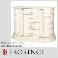 曲線に光沢感のある質感が豪華で美しい、サイドボードです。光沢感あるゴールドの金具部分にはクリスタルが付いています。真ん中の引き出しには細かな物を両側の扉部分には大きな物を収納出来て、便利にかつ高級感のあるインテリアにしてくれます。お洒落なランプやお花、陶人形やフォトフレーム、色々な飾り付で楽しんでください。もちろんTEL&FAX台にもおすすめです。 優雅で気品のあるフローレンスシリーズ。優しいアイボリーの気品ある美しさにゴールドのアクセントが高級感を醸し出します。 素敵な時間をエレガントにお過ごしいただける、そんなシリーズです。