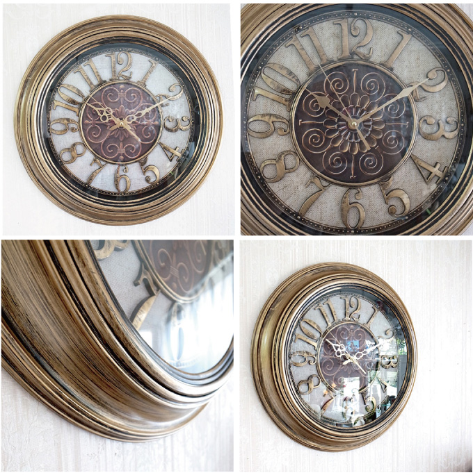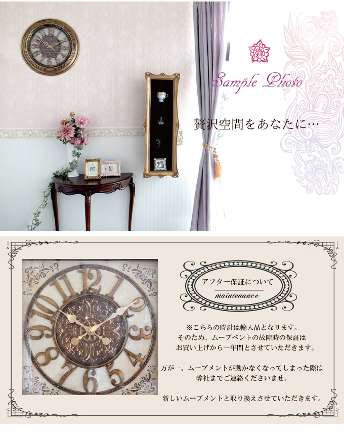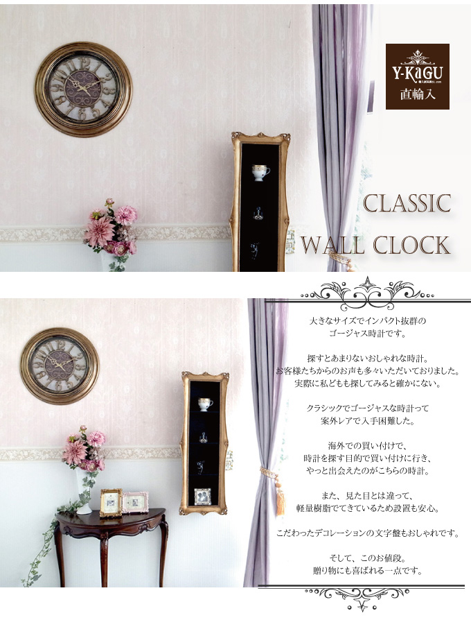 ブロンズカラーが印象的でゴージャスな掛け時計です。輸入家具ならではのレトロ×アンティークでおしゃれな時計。見やすい文字盤と使いやすいサイズで実用的です。重厚感のある見た目とは違い、軽量樹脂でてきているため設置もしやすく安心。お値段も魅力的です。クラシック、ヨーロピアンなテイストにぴったりです。贈り物にも喜ばれる一点です。