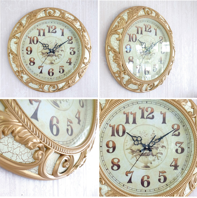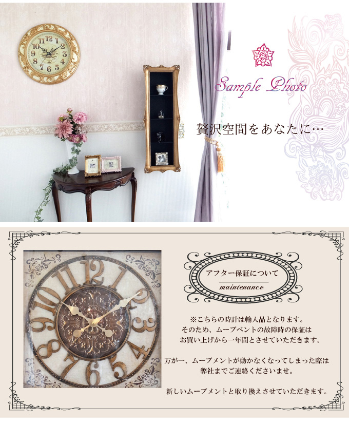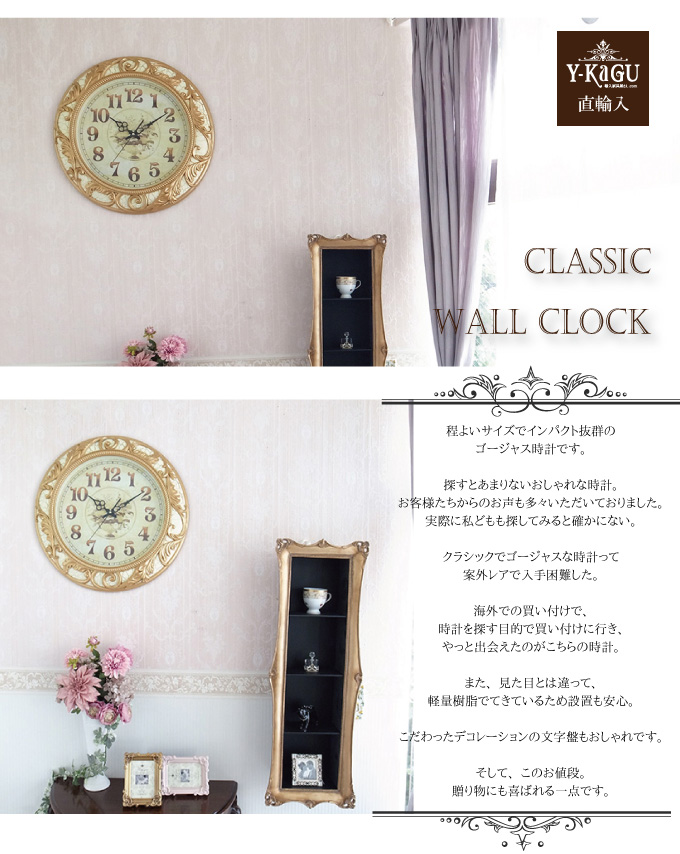 ロココ調の装飾が印象的でゴージャスな掛け時計です。輸入家具ならではのホワイト×アンティークにロココ調を組み合わせたおしゃれな時計。見やすい文字盤と使いやすいサイズで実用的です。重厚感のある見た目とは違い、軽量樹脂でてきているため設置もしやすく安心。お値段も魅力的です。姫系なテイストはもちろん、クラシックにもぴったりです。贈り物にも喜ばれる一点です。