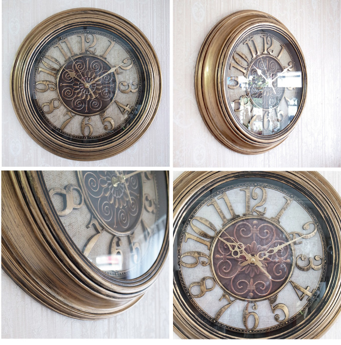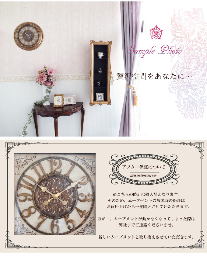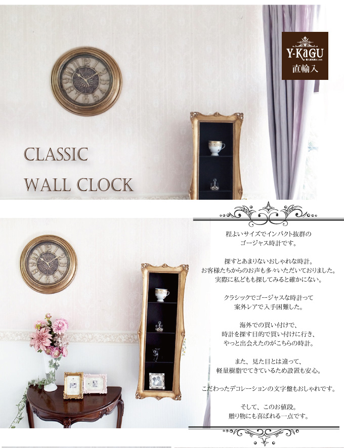 程よいサイズでインパクト抜群のゴージャス時計です。 探すとあまりないおしゃれな時計。お客様たちからのお声も多々いただいておりました。実際に私どもも探してみると確かにない。 クラシックでゴージャスな時計って、案外レアで入手困難した。 海外での買い付けで、時計を探す目的で買い付けに行き、やっと出会えたのがこちらの時計。 また、見た目とは違って、軽量樹脂でてきているため設置も安心。 こだわったデコレーションの文字盤もおしゃれです。 そして、このお値段。贈り物にも喜ばれる一点です。