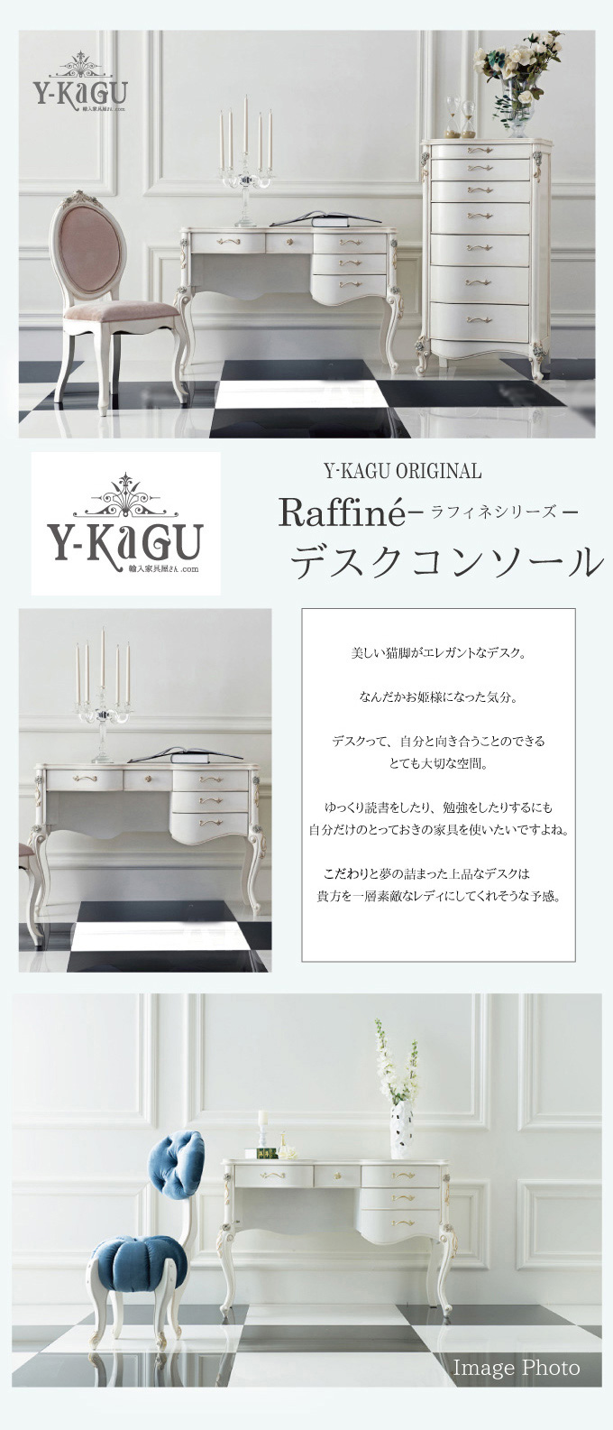 どこに行っても見たこのない。そんな家具をご提案したくて。だから当店オリジナルの完全直輸入で引いてきました!美しい猫脚がエレガントなデスク。ここまで美しいデザインの家具に出会うことってそうそうありません。この机、向き合った時からお姫様の始まり。そして、デスクって自分と向きあることのできるとっても大切な空間だから自分磨きに欠かせないマストアイテム。ゆっくり読書をしたり、勉強をしたりするにも自分だけのとっておきの家具を使ってほしい。こだわりと夢のつまった上品ンなデスクで貴方をより一層すてきなレディにしてくれそう。※こちらの商品は輸入品となります。主にオーストラリア、ヨーロッパ、アメリカで販売されている家具となります。また、アンティークなテイストに仕上げてありますことと、輸入品の性質上、多少の色むら・傷がございますこと予めご了承くださいませ。※【必ずお読みください】こちらの商品は主に輸入家具となっており、海外での生産となります。また、ヨーロッパ・ドバイ・アメリカなどといった海外向けに作られている商品となります。ほとんどが手作り・手塗装で制作されております。一点一点が手作業のため、塗装・仕上がりには個体差がございます。弊社での検品を行い、修正できる部分は修正してからの発送をしておりますが、アンティーク塗装仕上げ(離れると見えない程度)となっている個所がございますこと、予めご理解・ご了承の上、お買い求めください。
