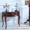 上質で重厚感あるベネシアシリーズ。コンパクトながら本格的なコンソールです。木のしっとりとした光沢が高級感があります。天板にはレザーを貼り、より美しい仕上がりに。滑らかな曲線と猫脚がエレガントな空間を演出します。チェアと合わせればデスクスペースに。ミラーと合わせてドレッサーとして使用しても素敵です。すっきりとしたデザインなので、ちょっとしたスペースに設置できます。マホガニーの木目と天然木本来の味を生かして作られた、温もり感じる手作りの美しさをお楽しみください。