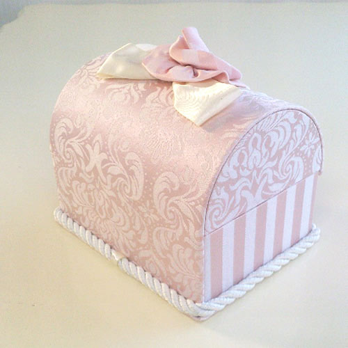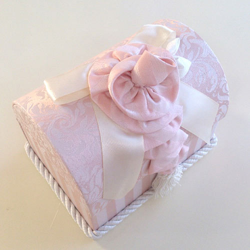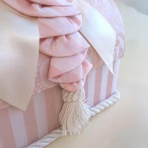 ◆フェミニンな淡いピンクと白のコンビネーションが大人気!ダマスク模様とストライプの織模様は、洗練された上質感が漂います。◆中も生地貼りです。◆同じ生地の小物入れ・ダストボックス・ティッシュボックスもございます。
