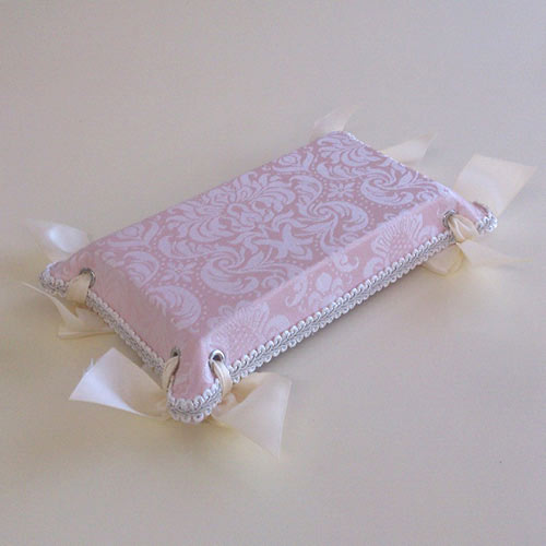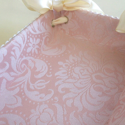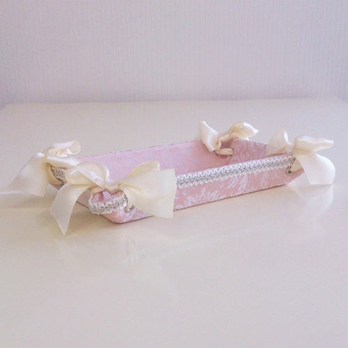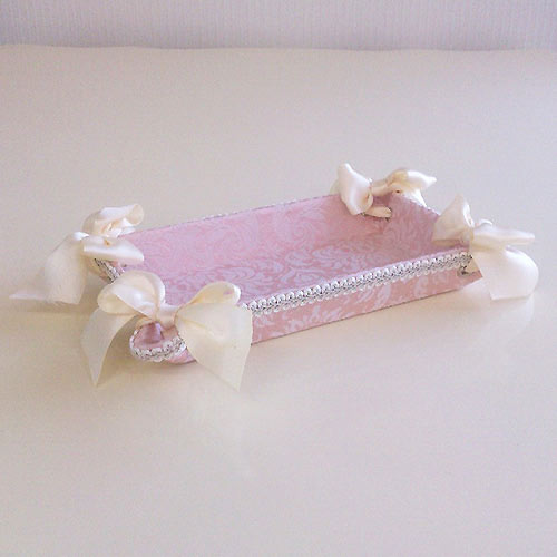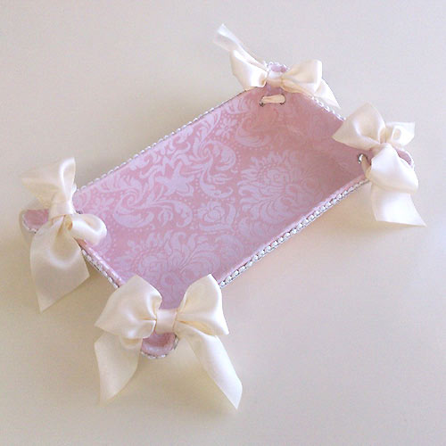 ◆フェミニンな淡いピンクと白のコンビネーションが大人気!ダマスク模様とストライプの織模様は、洗練された上質感が漂います。◆人気の秘密は女性の心を擽るリボン使い。エレガントで高級感の有るデザインと実用性を兼ね備えた商品にあります。◆トレー内側も側面と同じ生地張りです。◆同じ生地のBOXセット・ティッシュボックスもございます。