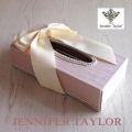カルトナージュファンの方必見!樹木のような縞模様を描くモアレを使用した高級感溢れるChinon(シノン)シリーズの登場です!この生地はジェニファーテイラー社と日本メーカーの共同制作によるもので、生地も国産品となり、この作品のために織られた生地となります。上品かつフェミニンに仕上げました新シリーズChinon。是非ご堪能ください。 大胆に使ったビッグリボンが大人可愛い上品な雰囲気を醸す新デザイン。ゴテゴテしていないシンプルなラインのリボンですのでとっても上品。リボンの生地はジェニファーテイラーらしいしっかりした生地を使用。 薄型のティッシュBOX対応です。