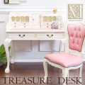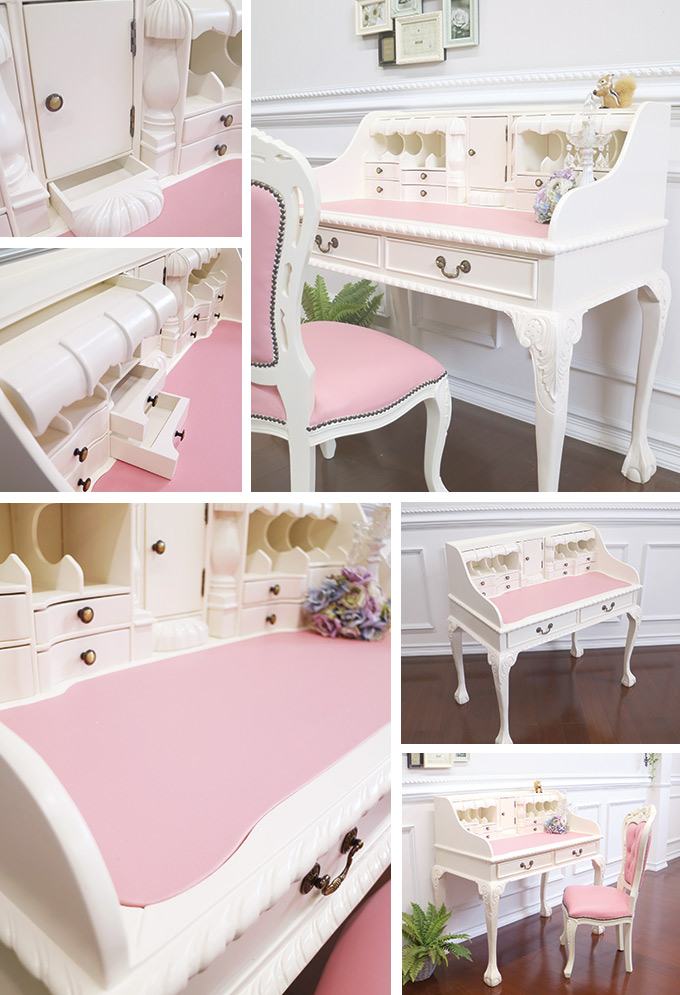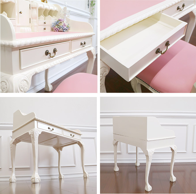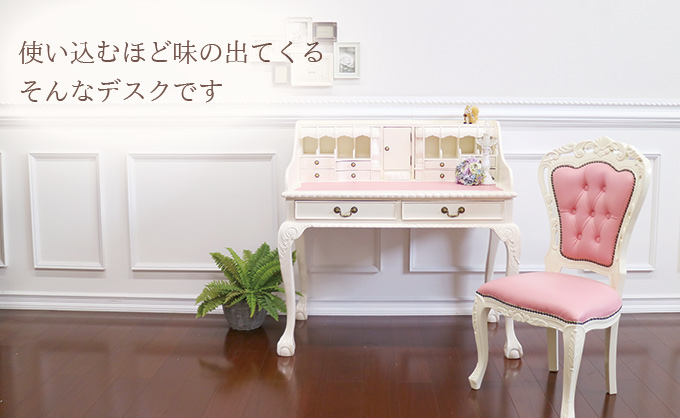 「遂に帰ってきました!名作デスクパワーアップして復活です」-マホガニー材使用・MANON ROCOCO-マノンロココ- トレジャーデスク(ホワイト)「あっ、ここも開く!」 いろんな所に隠し扉が付いている遊び心たっぷりのデスク。それがこの「トレジャーデスク」たくさんの引き出しや、複雑な構造のため、なかなか品質の改善が難しく、どうしても作りが荒くなってしまい、販売を中止せざる得なかったデスクがついに復活しました。今回、生産国内の工場の中でもトップのクォリティを持つ工場での生産に変え、一つ一つの作りを丁寧に仕上げることに成功しました。一生モノのように使ってほしく、ずっとずっと、貴方と年を重ねていってほしい。そんな思いがあったので、品質には妥協できませんでした。 2年近くお待たせしてやっとの完成です。完全Y-KAGUオリジナルのこだわりで作られたデスク。お楽しみください。※【必ずお読みください】こちらの商品は主に輸入家具となっており、海外での生産となります。また、ヨーロッパ・ドバイ・アメリカなどといった海外向けに作られている商品となります。ほとんどが手作り・手塗装で制作されております。一点一点が手作業のため、塗装・仕上がりには個体差がございます。弊社での検品を行い、修正できる部分は修正してからの発送をしておりますが、アンティーク塗装仕上げ(離れると見えない程度)となっている個所がございますこと、予めご理解・ご了承の上、お買い求めください。