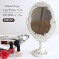 実用性にも優れたおしゃれなスタンドミラー 両面対応 テーブルスタンドミラー オーバル アンティークホワイト イタリアンデザイン アンティーク調のエレガントな卓上ミラーです。 コンパクトなサイズですが、お顔全体がすっぽり映ります。 裏表でデザインが異なる便利な両面対応です。 場所を取らない置き型鏡は、洗面所で使ったり チェストの上に置いたりと、お好きな場所で活躍します。 ギフトやプレゼントにもおすすめです。