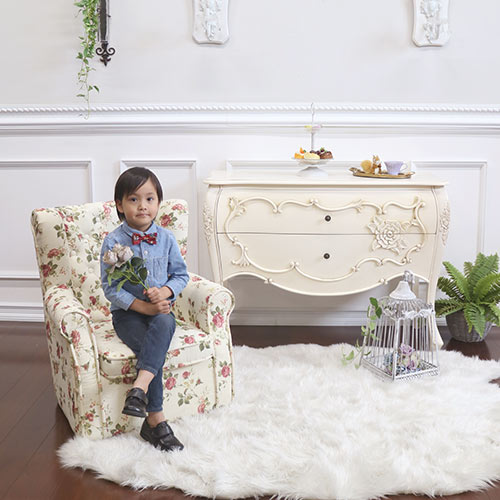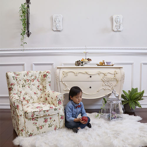 「お子様だって本格派」 インテリア界ではジャンル問わずで愛されているウィングソファ。そんなウィングソファを子供サイズで作りました。エレガントなローズのファブリックとなり、大人っぽく飽きのこない柄のミニソファです。大人用のヨーロピアンクラッシックなソファをそのまま小さくお子様用に作り変えてあるので、耐荷重もなんと80kgと大人の方が座っても問題なく、しっかりとした出来栄えです。座面も広く、肘部分も湾曲しておりますので、腰の座った赤ちゃんからご利用いただけます。お人形を置いたり 猫ちゃんワンちゃんのくつろぎの場所にもピッタリなオシャレで可愛いソファです※【必ずお読みください】こちらの商品は主に輸入家具となっており、海外での生産となります。また、ヨーロッパ・ドバイ・アメリカなどといった海外向けに作られている商品となります。ほとんどが手作り・手塗装で制作されております。一点一点が手作業のため、塗装・仕上がりには個体差がございます。弊社での検品を行い、修正できる部分は修正してからの発送をしておりますが、アンティーク塗装仕上げ(離れると見えない程度)となっている個所がございますこと、予めご理解・ご了承の上、お買い求めください。