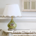 細やかなギャザーのシェードがとても上品で可愛らしいテーブルランプ。ガラス製の本体となっており、美しいフラワーレリーフが描かれています。本体のガラス部分にも灯りが点くので、空間を美しく演出します。消灯時は黄緑色ですが、灯りをともすとまた違った表情を見せてくれます。柔らかな光で癒されてください。