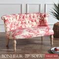 レッド×ホワイトのトワルドジュイ柄が美しい2人掛けソファです。背もたれはボタン留めと羊の角のようにくるりと丸く、全体的に丸みを帯びた可愛らしいデザインです。一般的なソファよりもコンパクトなサイズで、ワンルームや狭いお部屋でも気軽に置けます。適度な硬さで座り心地も良く、ファブリックの肌ざわりも楽しめます。フランス語で幸運を意味する「ボヌール(Bonheur)」の言葉通り、至福の時間を過ごせるソファです。