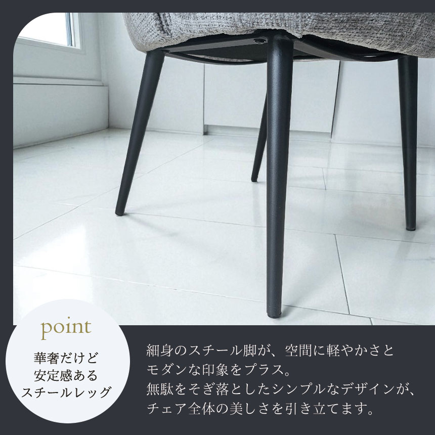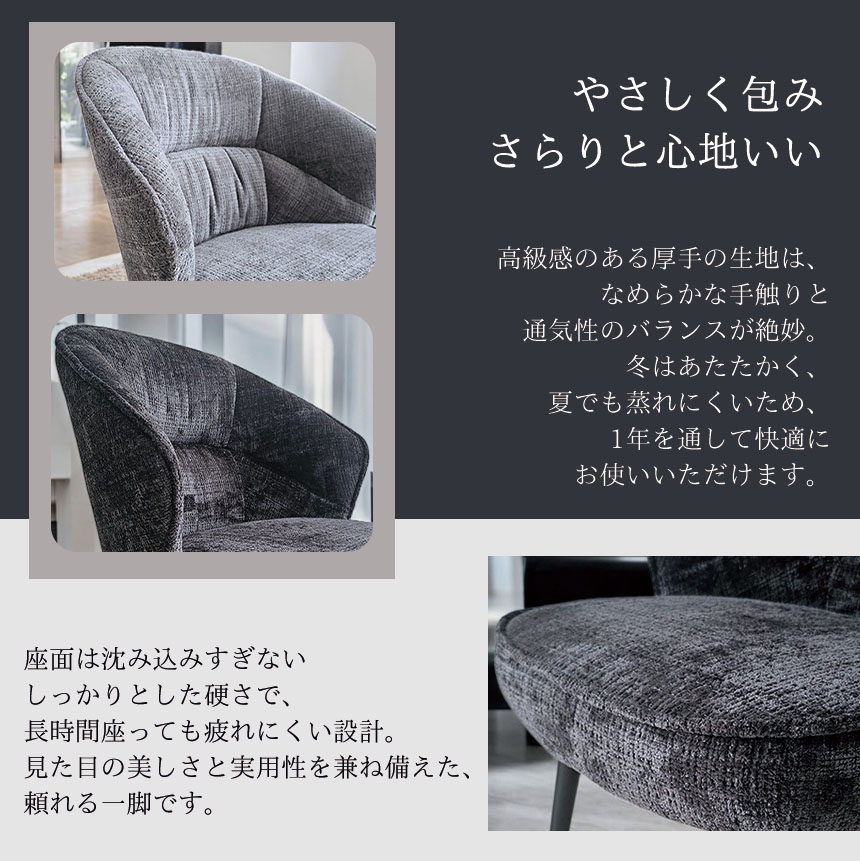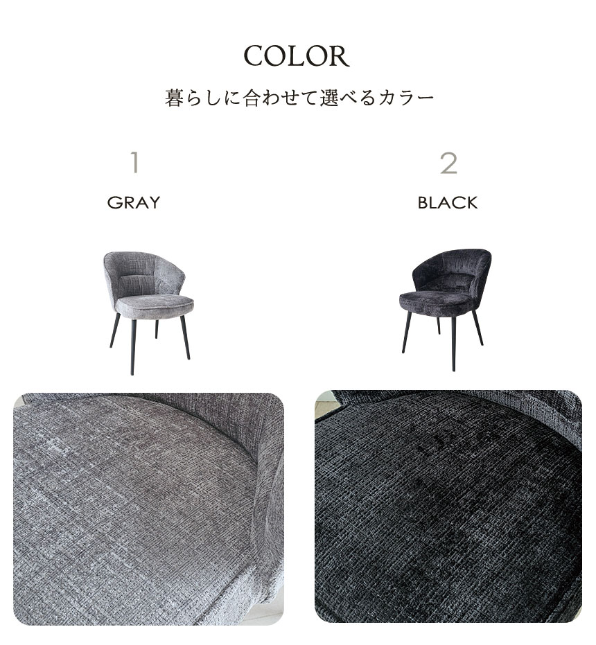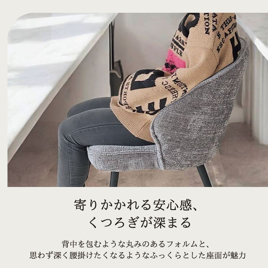 ゆったりとした時間を過ごしたいあなたに。 背中を包むような丸みのあるフォルムと、思わず深く腰掛けたくなるようなふっくらとした座面が魅力のダイニングチェア「ELLY(エリー)」。 このチェアの魅力はなんといっても1人掛けソファにも匹敵する座り心地。 また、おしゃれなスチール脚との組み合わせがモダンな印象を与え、リビングやダイニング、ワークスペースなどさまざまな空間に溶け込みます。 カラーは落ち着きのあるブラックとグレーの2色展開。 2脚セットなので、並べて置くだけで統一感のあるコーディネートが完成します。