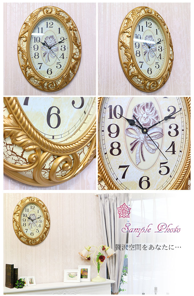 見やすい文字盤で実用サイズのゴージャスな時計です。 探すとあまりないおしゃれな時計。お客様たちからのお声も多々いただいておりました。実際に私どもも探してみると確かにない。 クラシックでゴージャスな時計って、案外レアで入手困難した。 海外での買い付けで、時計を探す目的で買い付けに行き、やっと出会えたのがこちらの時計。 また、見た目とは違って、軽量樹脂でてきているため設置も安心。 こだわったデコレーションの文字盤もおしゃれです。 そして、このお値段。贈り物にも喜ばれる一点です