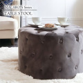 Φ60cmの大きなスツール。天板部分が平らで、大きさもあるのでサイドテーブルとしても使える画期的な兼用スツールです。どんな色とも合わせやすいチャコールブラウン。お部屋が楽しい空間になります。通常のスツールよりも大きく、ゆったりとした座り心地で2人でも腰掛けられるほどの大きさ。本当はサイドテーブルとチェアを別々に置きたいけど、スペースがないから…という場合にも、これなら空間の有効活用ができます。チェスターフィールドのデザインを使ったボタン留め仕上げは立体感があり、アクセントとしても見栄え抜群。座面部分だけでなく、側面もボタン仕上げなので高級感もあります。生地はしっとりとした質感のベロア生地を使用しているので、通年を通して心地よい肌ざわり。