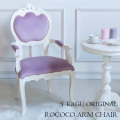 大人可愛い空間を叶える マホガニー材使用 ロココアームチェア ハートを意識した可愛らしい背もたれと、ベロア調のファブリックの組み合わせが可愛いチェア。 派手になりすぎない優しいカラーで上品な仕上がりです。 ロココ調の繊細な彫刻がより一層雰囲気を醸し出します。