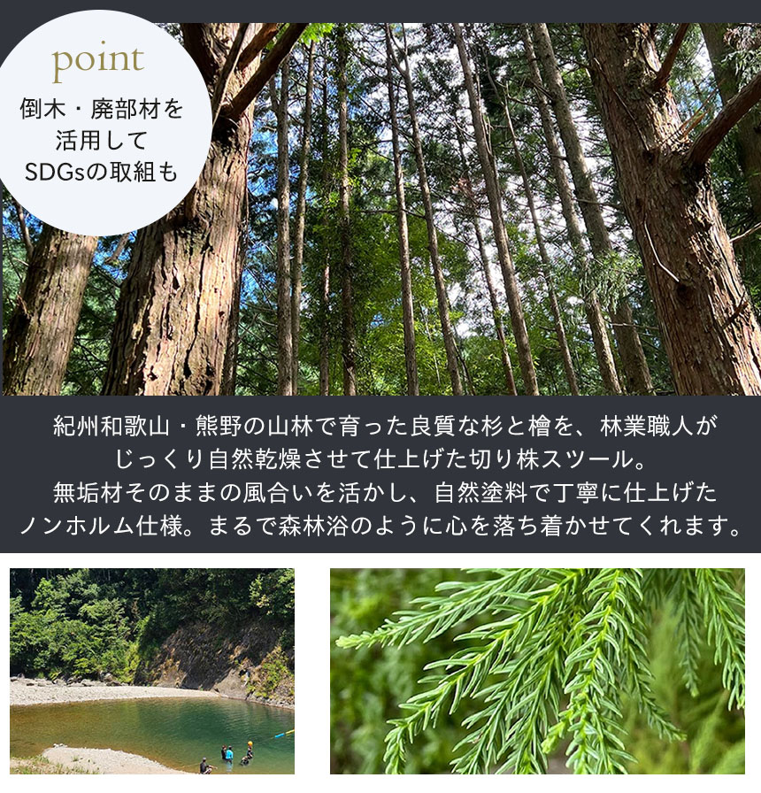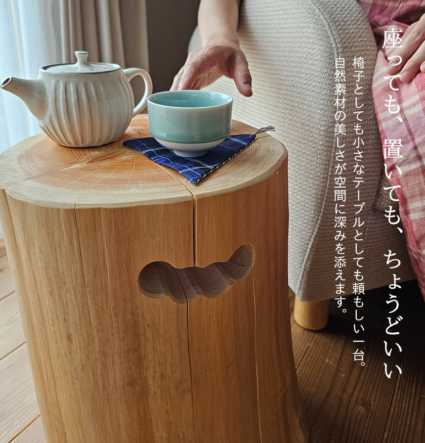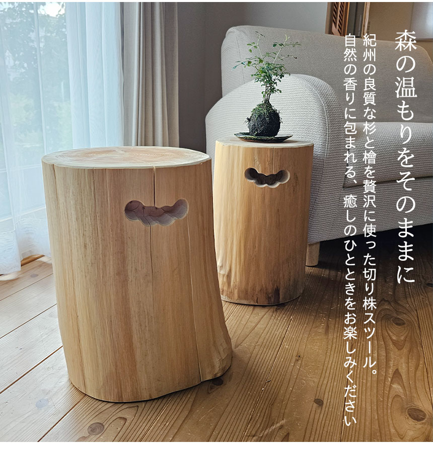 こちらの商品は一見、Y-KAGUのクラシック家具の世界とは少し異なるアイテムかもしれません。 でも実はこのスツール、私たちにとってちょっと特別なご縁があるんです。 というのも、 弊社のスタッフが生まれ育ったのは、紀州・和歌山。 その土地の自然や文化、人のあたたかさに育てられたご縁から、林業を営む地元の方から「ぜひ一度紹介してもらえないか」とお声がけをいただきました。 いつもとは少し趣の違う商品ではありますが、Y-KAGUとしても、和歌山の自然と人の営みに少しでも寄り添えるお手伝いができればと思い、今回ご紹介する運びとなりました。 さて、今回ご紹介するこちらの切り株スツールは、紀州の山々で育った杉・檜を使った丸太そのものの存在感と、丁寧に施された自然塗装の仕上がりが魅力です。座るだけでほのかに香る木のアロマが、あなたの心をそっと和ませてくれるはず。和モダンから北欧ナチュラルまで、どんなインテリアにも寄り添います。