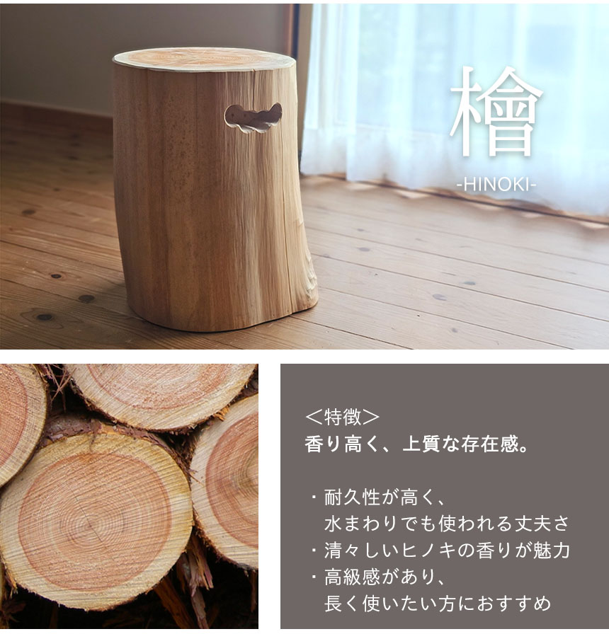 | 製品名: | 切り株スツール 国産スツール 天然木 スツール 檜(ヒノキ)杉(スギ)丸太椅子 木製チェア 和風インテリア ノンホルム ナチュラルインテリア |