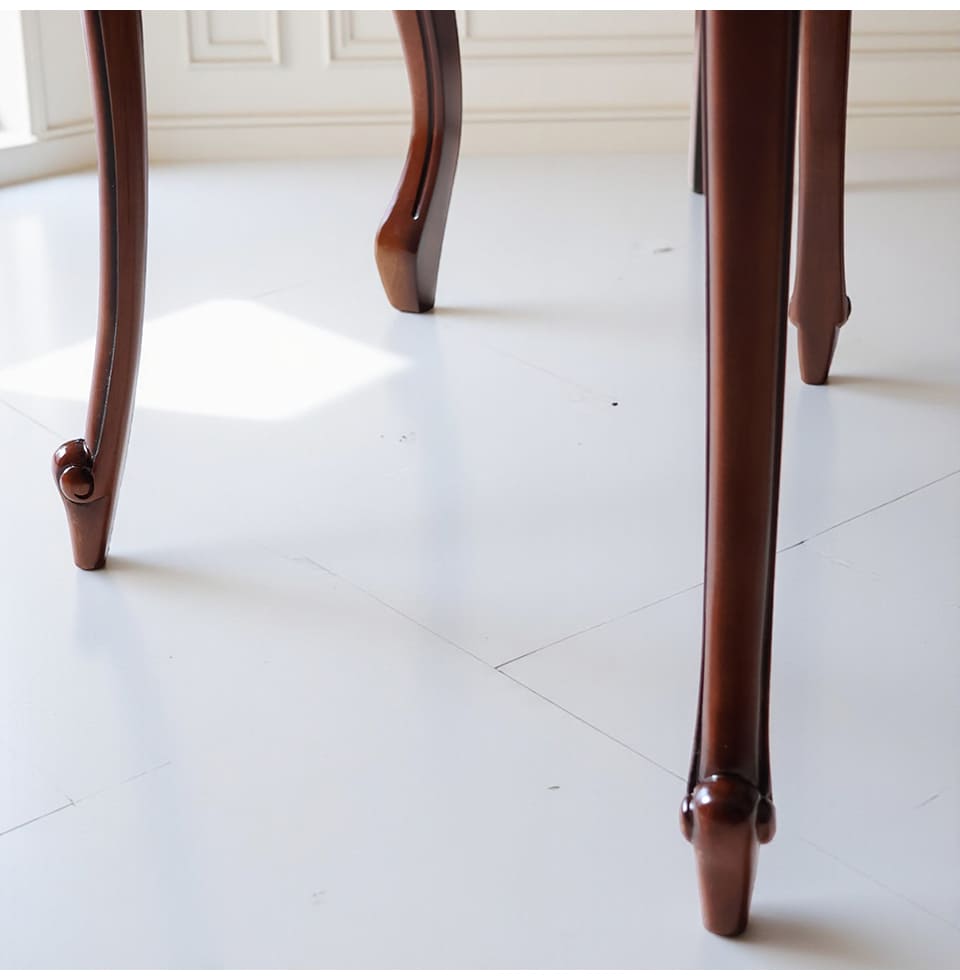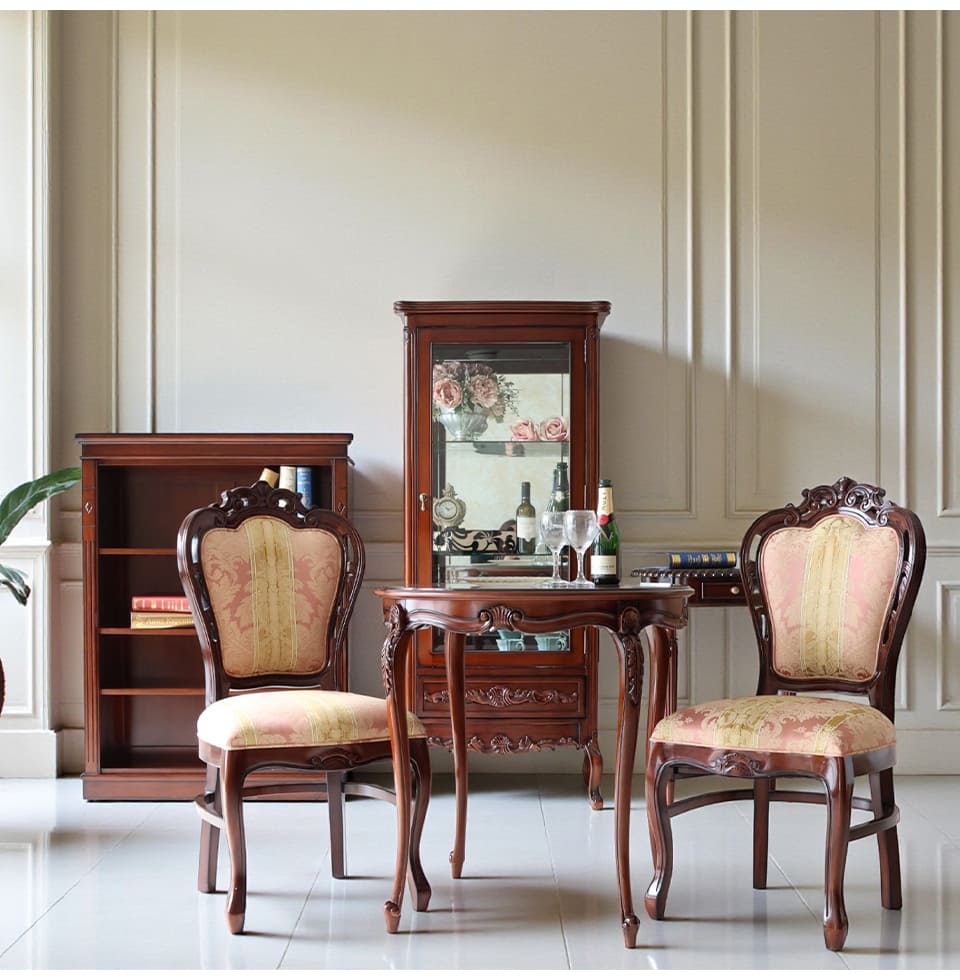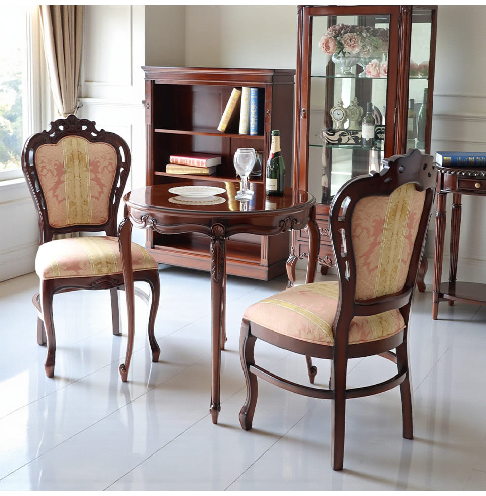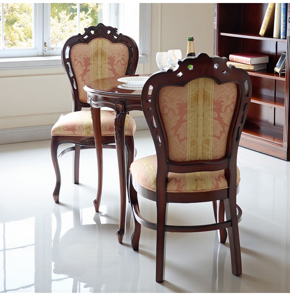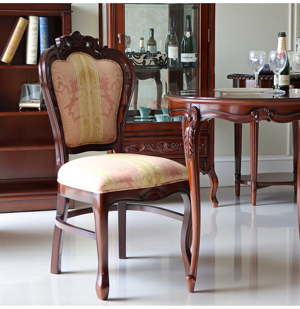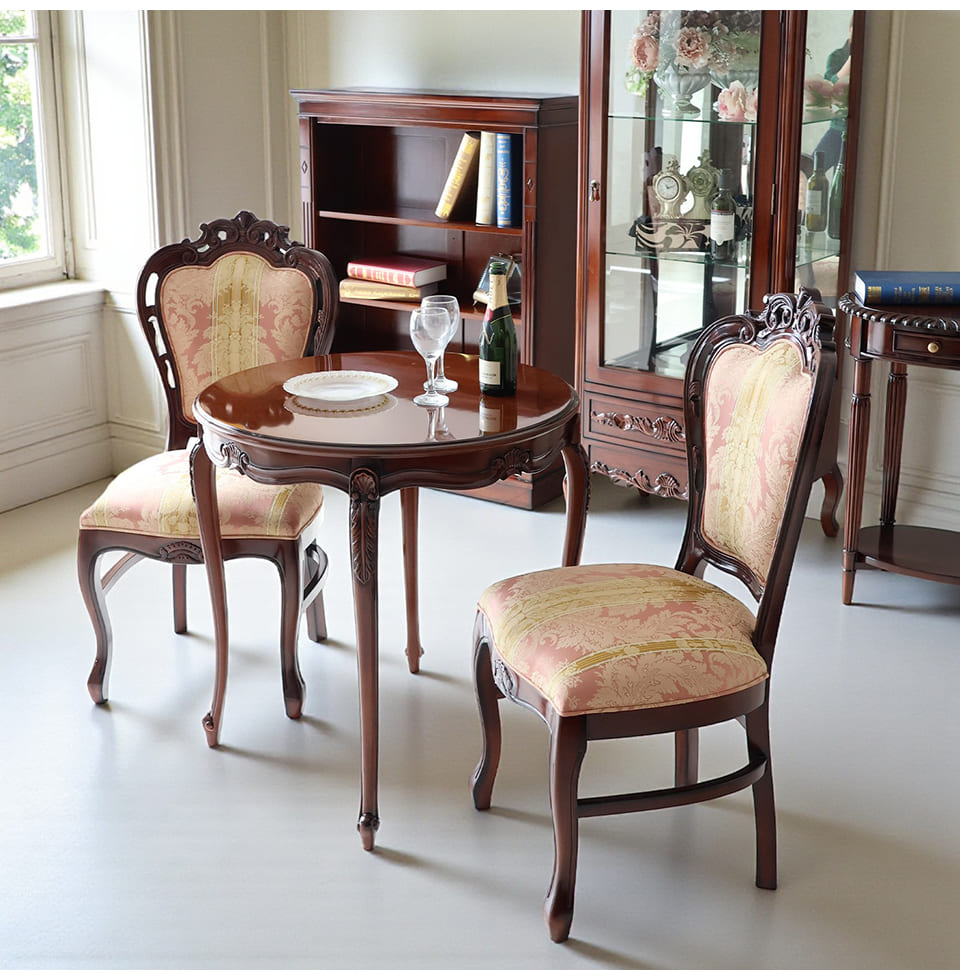 「華やかさも欲しいけれど、甘すぎるのは苦手」そんな大人の感性に寄り添うピンクストライプの2人掛けタイプのダイニングセット。チェアの座と背には、輸入家具らしいダマスク調のパターンを織り込んだ生地を採用し、光の角度でさりげなく表情が変わります。フレームには細かな彫刻とやわらかな曲線を施し、猫脚のラインが床に美しい影を落とします。φ75cmの丸テーブルは、ティータイムにも軽い食事にも使いやすく、省スペースなリビングダイニングや窓辺のカフェコーナーにぴったり。マホガニー家具ならではの深みあるブラウンが、和室にも洋室にも自然になじみます。
