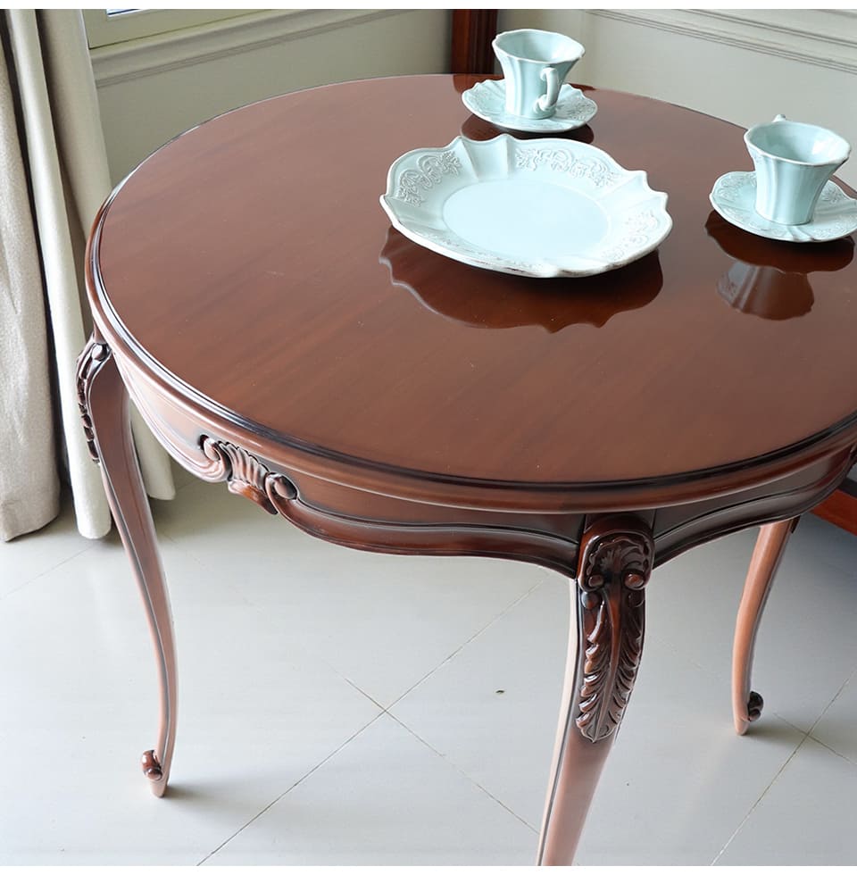 天板の上品な光沢に、脚元や幕板へ丁寧に施された繊細な彫刻。 立体感のある装飾が、コンパクトな中にも上品な存在感を添えます。 小さくても、本物志向を楽しめる一台です。