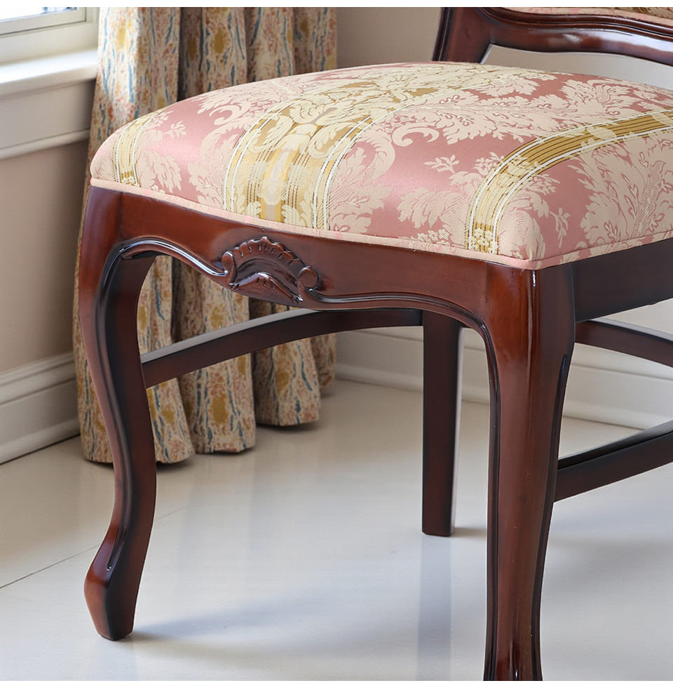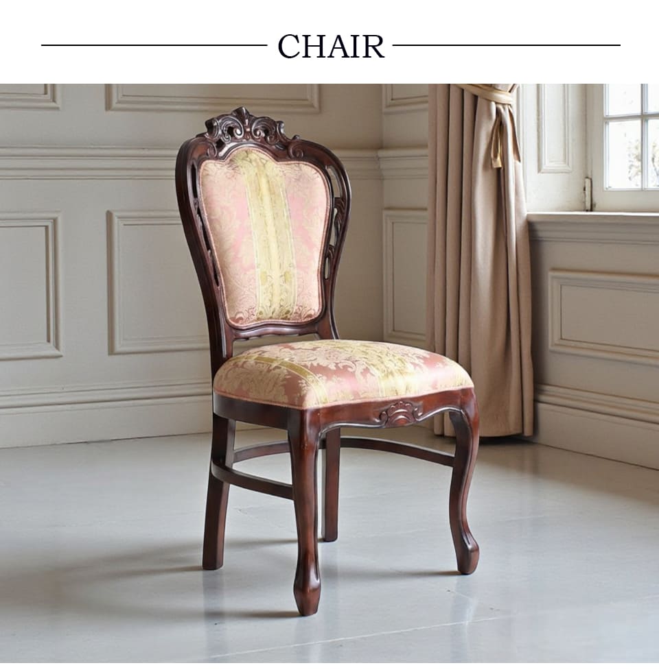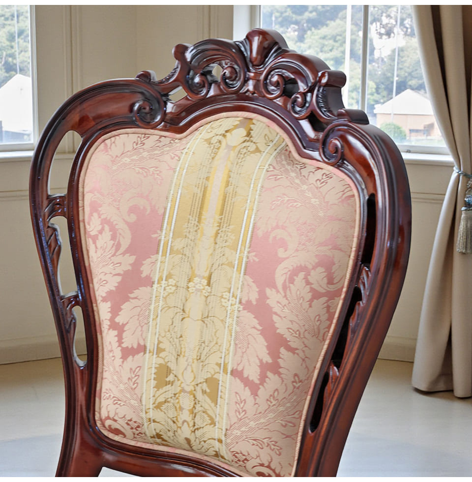 ![]() 主役を張れる一脚 繊細な透かし彫りと、立体感のあるトップ装飾。 やわらかな曲線で縁取られた背もたれが、クラシックの気品を美しく引き立てます。 淡く上品なピンクの張地には、さりげない柄をあしらい、 空間にやわらかな華やぎをプラス。 背もたれは広く、ゆったりと身体を預けられる安心感のあるフォルム。 優雅に伸びる曲線脚が、重厚さの中に軽やかさを添えています。 前から見ても、横から見ても、そして後ろ姿まで絵になる一脚。 空間にそっと気品を宿す、エレガントなクラシックチェアです。