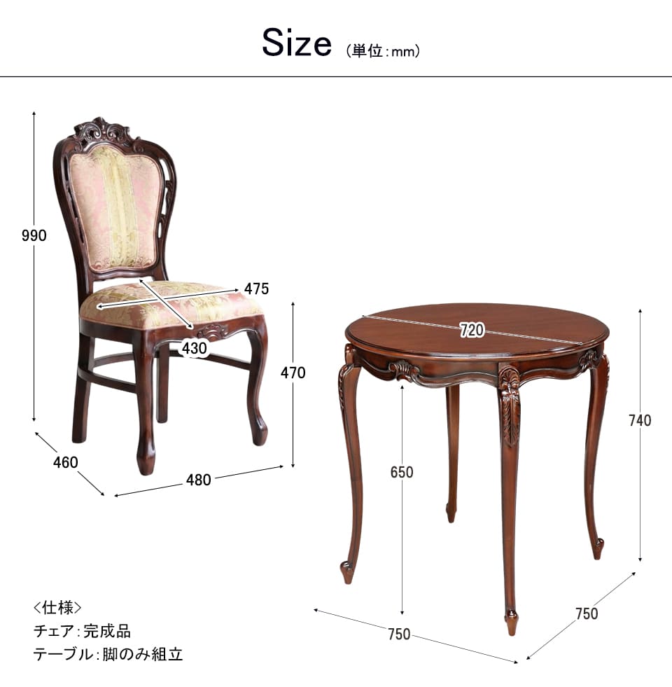 | 仕様 | <チェア> 完成品 <テーブル> ・組立式(脚取り付け) |