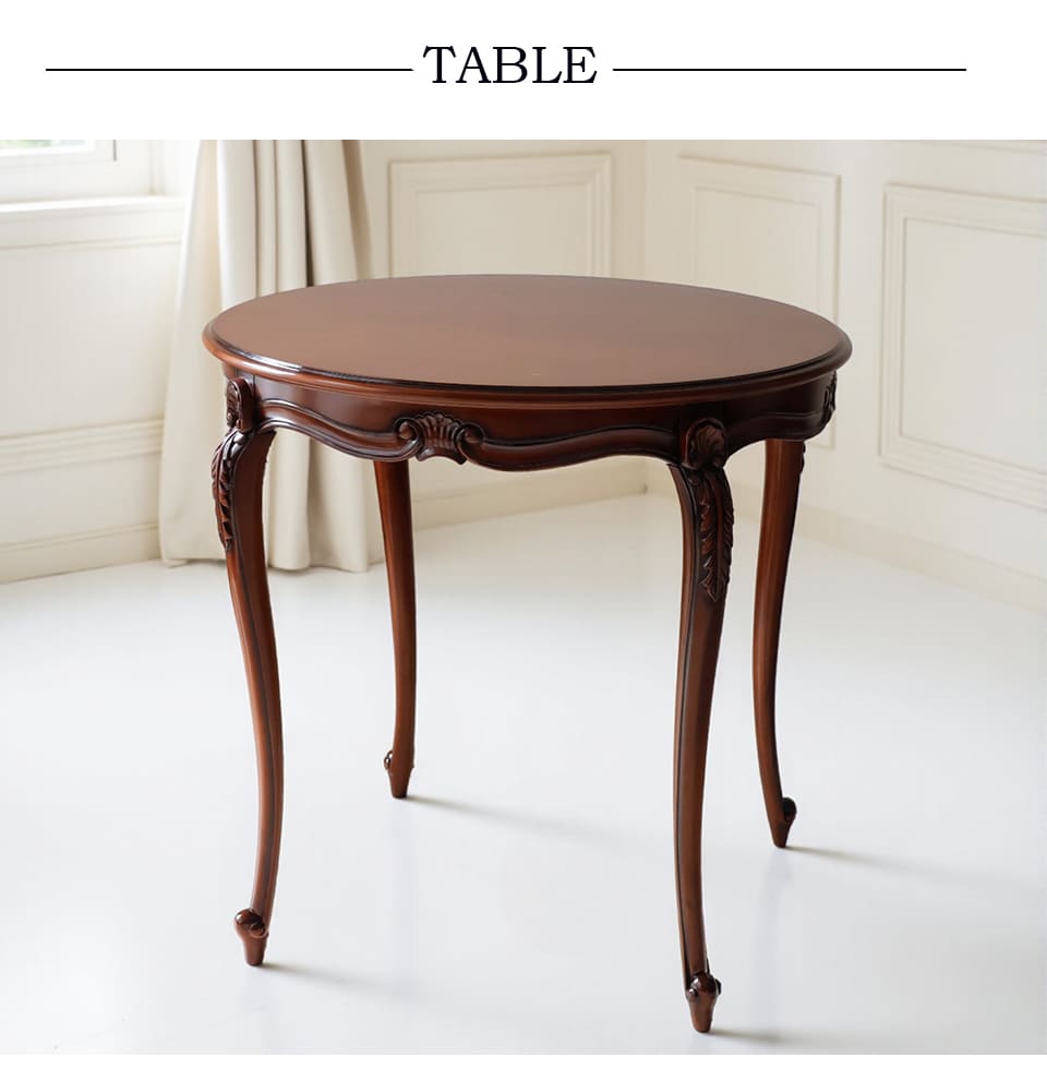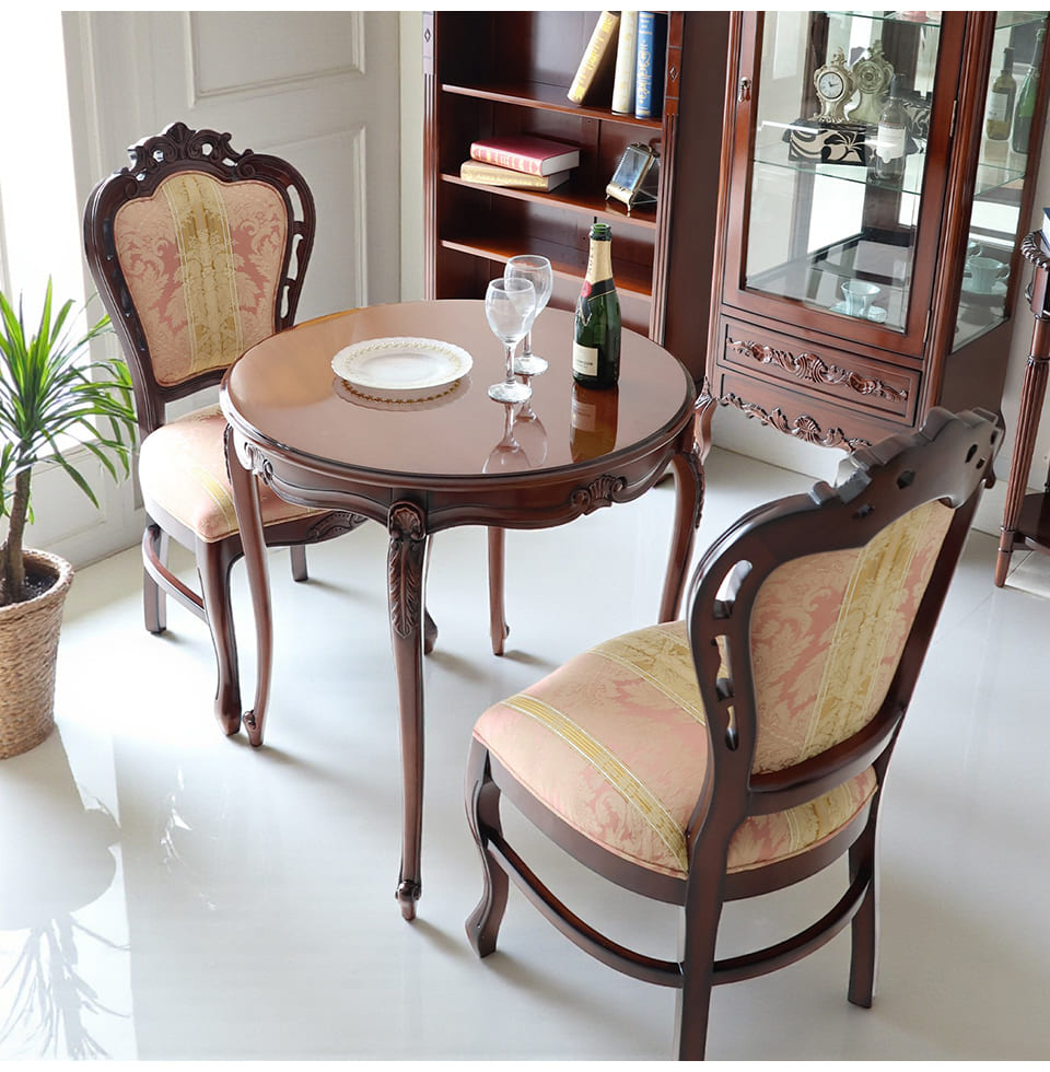 置くだけで、サロンのような佇まい Malina Cassili マリナカッシーリ ヨーロピアン ダイニングセット3P(ピンクストライプ) 2人掛け 限られたスペースでも絵になるクラシック空間が叶う、 マリナカッシーリのヨーロピアンダイニングセット。 直径75cmの丸テーブルは、2人で向かい合っても窮屈にならないほどよい広さ。 角のないフォルムが動線を妨げず、ワンルームや1LDKにもすっきり収まります。 艶やかなマホガニー調ブラウンの天板に、 上品なピンクのチェアが並ぶだけで、日常のワンシーンがサロンのように。 背もたれの優雅な曲線と、鋲打ちのディテールが、 空間にクラシックの格を添えます。 朝のコーヒーも、夜のワインも、自然と丁寧に味わいたくなる。 そんな時間を生み出すダイニングセットです。 ![]() Malina Cassili(マリナカッシーリ) コレクション Malina Cassiliシリーズは、木目が美しいマホガニー材を使用し、艶やかな光沢が魅力。 クラシック&エレガンスな雰囲気のシリーズ。 毎日の毎日の生活を楽しく、豊かにしてくれるシリーズです。 ![]() 小さな空間に、正統派クラシックを 優雅なガブリオールレッグが、空間に確かな存在感をもたらします。 ロマンティックで可愛らしいチェアが艶やかなマホガニー調ブラウンと調和し、 前から見ても、後ろ姿も絵になる佇まい。 ![]() テーブルは直径約75cm、高さ約74cm。 コンパクトでありながら、大人2人が向かい合い、 プレートやグラスをゆったりと並べられる絶妙なサイズ感です。 脚元には、クラシックなガブリオールレッグを採用。 繊細な彫刻のディテールまで丁寧に仕上げ、上品な存在感を漂わせます。 ![]() 差尺は約27cm 差尺27cmのちょうどいいバランス。 テーブルとチェアの高さバランスがしっかり取れているため、 自然な姿勢で食事やティータイムを楽しめます。 膝まわりにもゆとりがあり、立ち座りもスムーズ。 見た目の美しさだけでなく、日常使いの快適さまで考えられた設計です。 ![]() 塗装はウレタン仕上げ ウレタン塗装の最大の特徴は、耐熱性や耐久性に優れていること。 水分も染み込みにくいので、水気にも強く、 軽い汚れ等はさっと拭き取ることができます。 ![]() 小さくても、妥協しないクラシック テーブルは、直径75cmのコンパクト設計。 それでいて、優雅なガブリオールレッグと上品な艶感が、 空間に確かな品格を添えてくれます。 限られたスペースでも、本物志向を楽しめる一台。