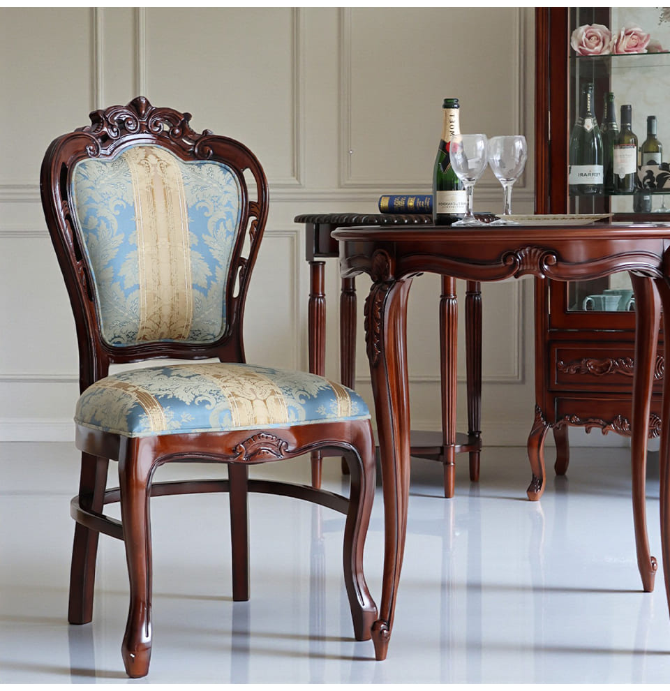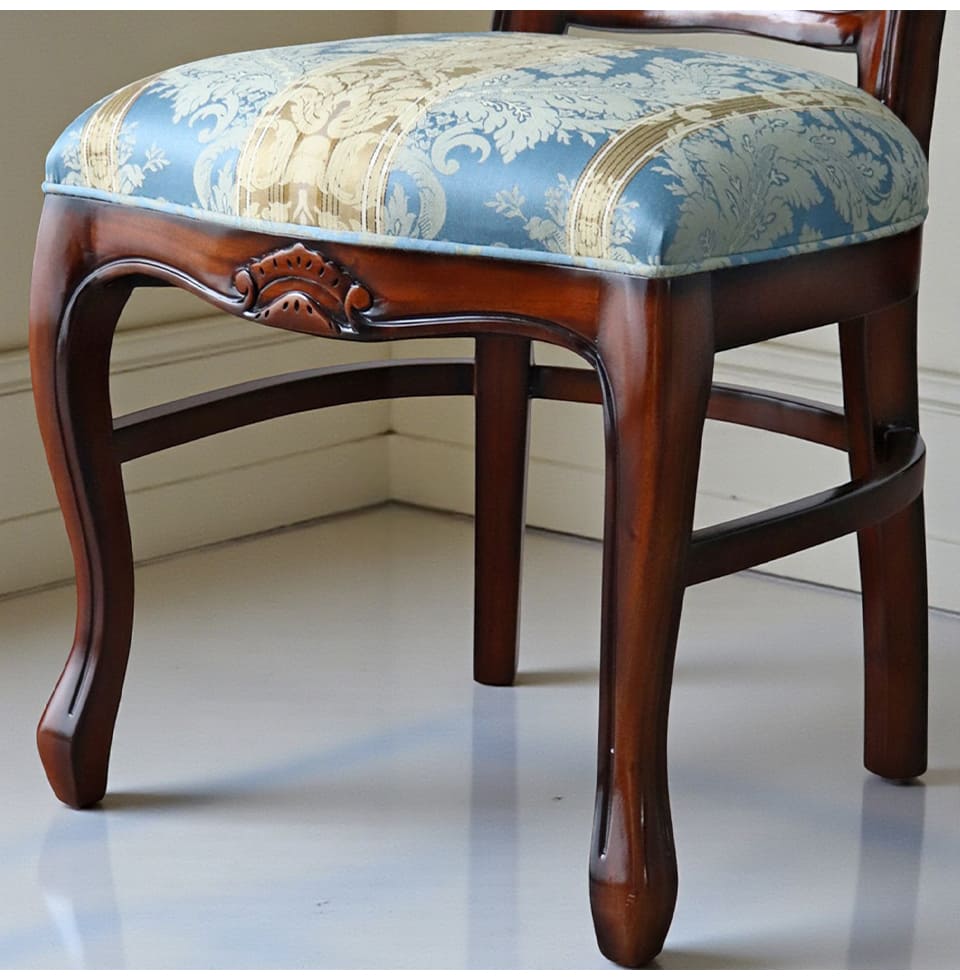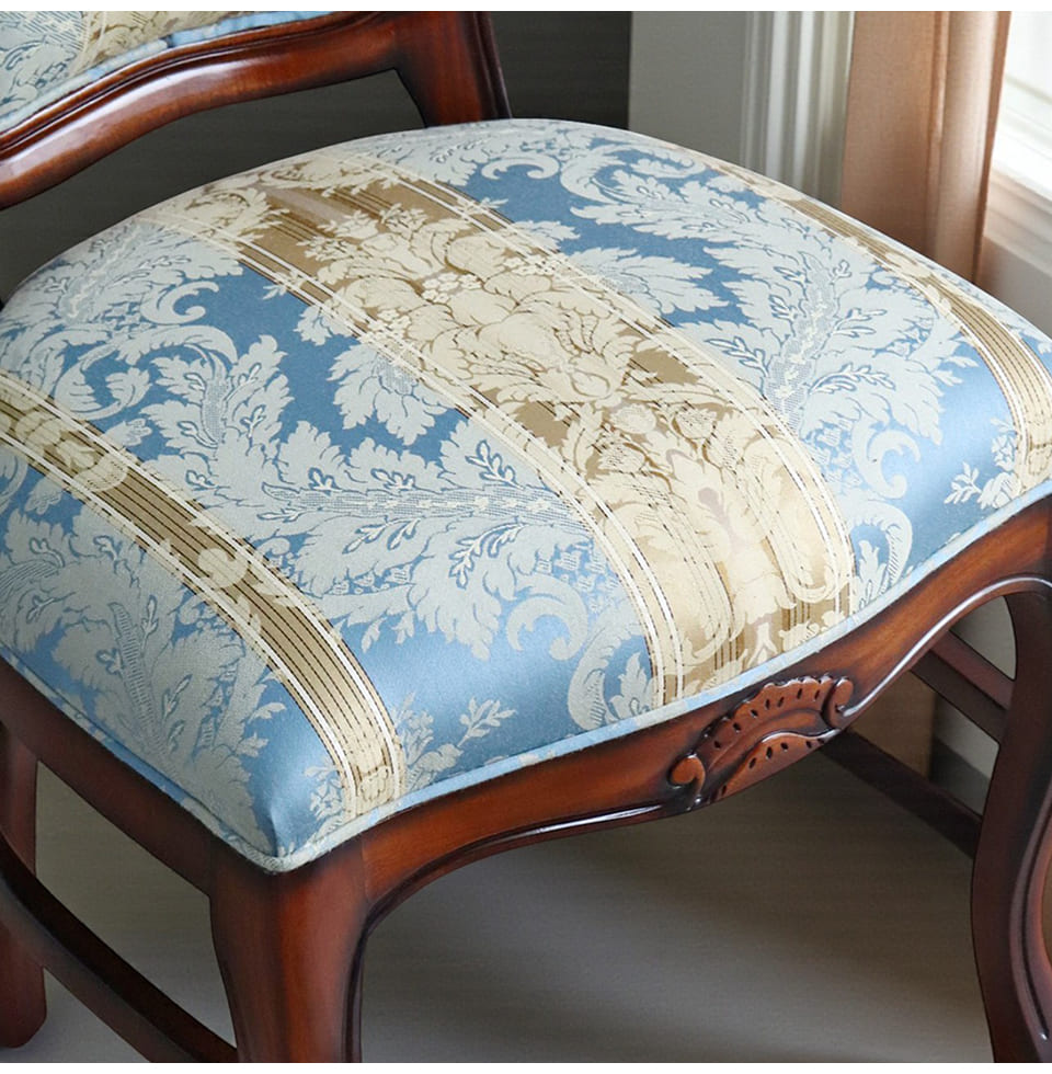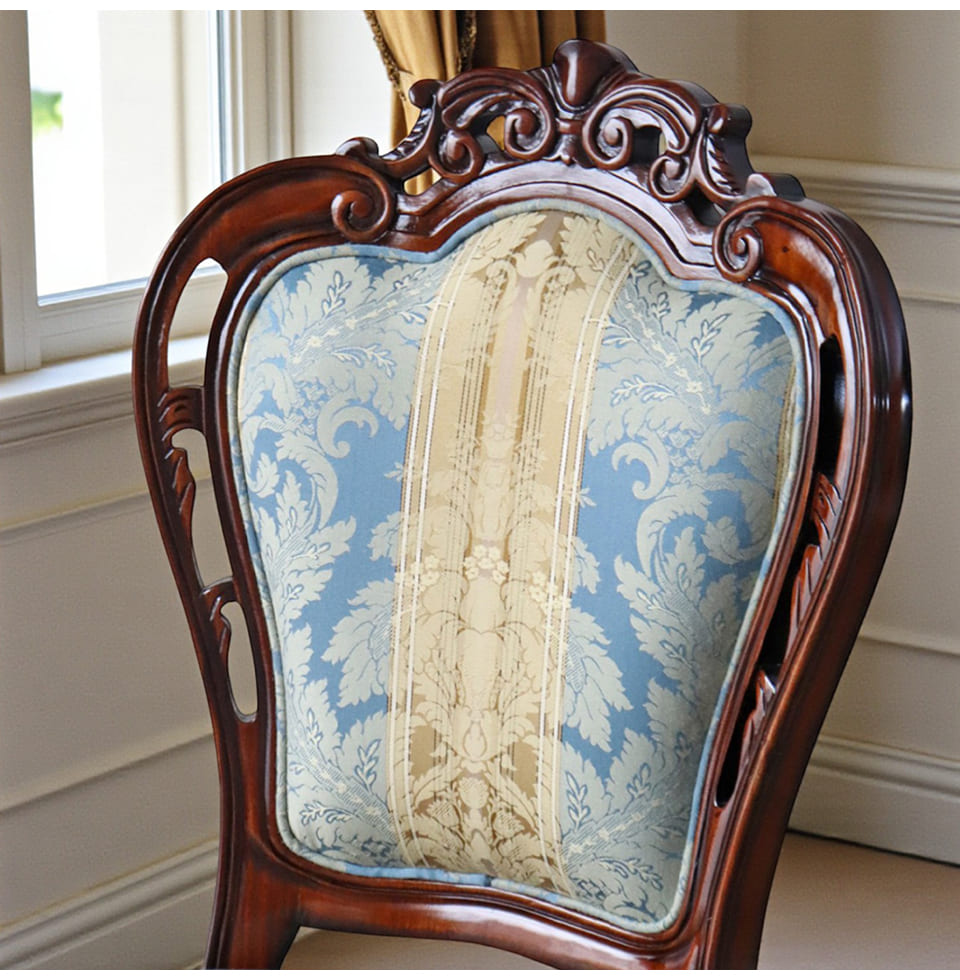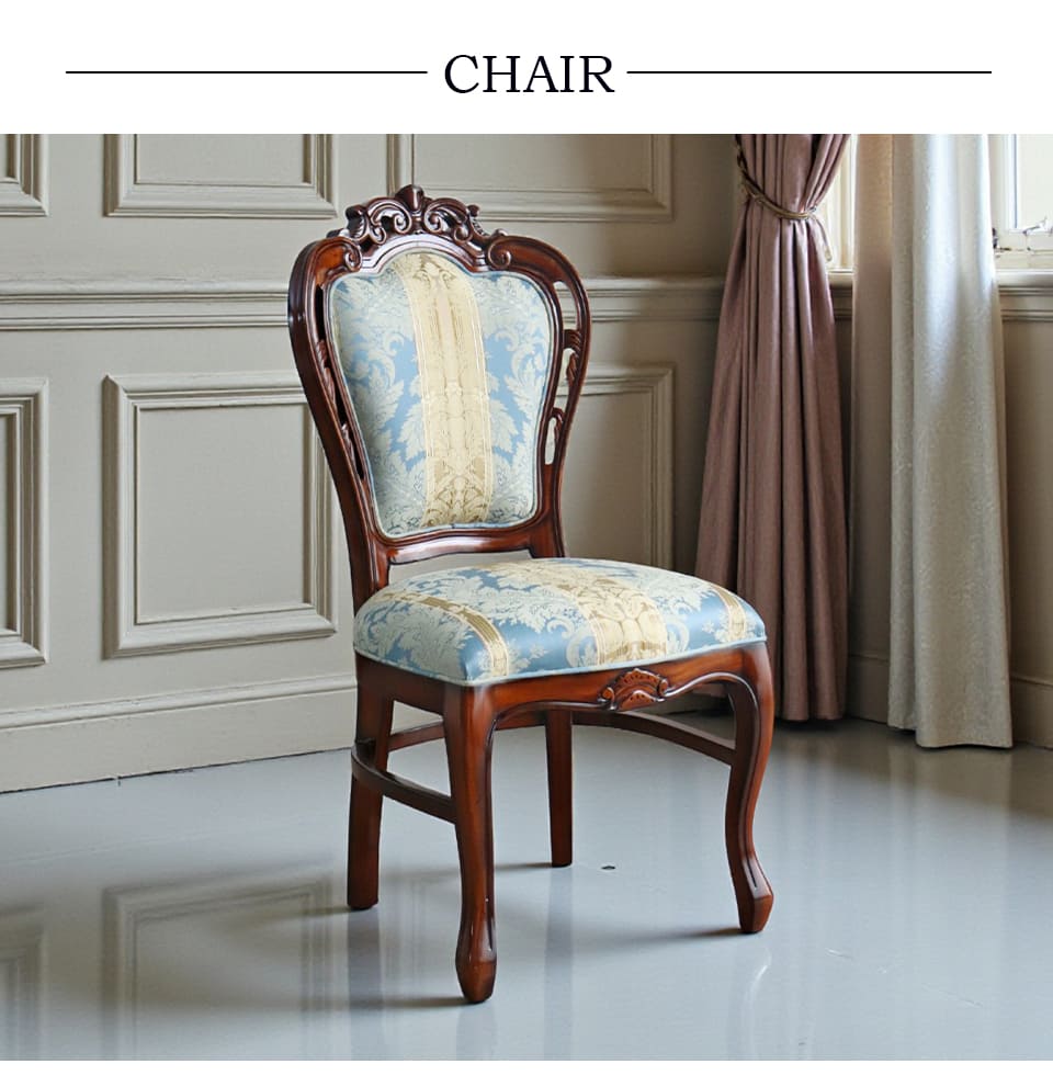 ![]() 主役を張れる一脚 繊細な透かし彫りと、立体感のあるトップ装飾。 やわらかな曲線で縁取られた背もたれが、クラシックの気品を美しく引き立てます。 淡く上品なブルーの張地には、さりげない柄をあしらい、 空間にやわらかな華やぎをプラス。 背もたれは広く、ゆったりと身体を預けられる安心感のあるフォルム。 優雅に伸びる曲線脚が、重厚さの中に軽やかさを添えています。 前から見ても、横から見ても、そして後ろ姿まで絵になる一脚。 空間にそっと気品を宿す、エレガントなクラシックチェアです。