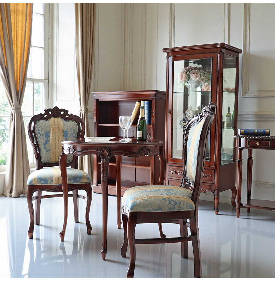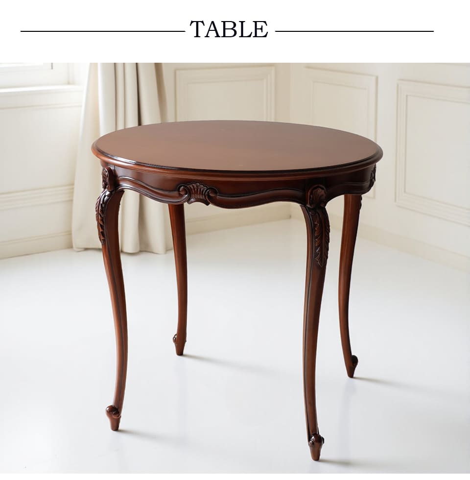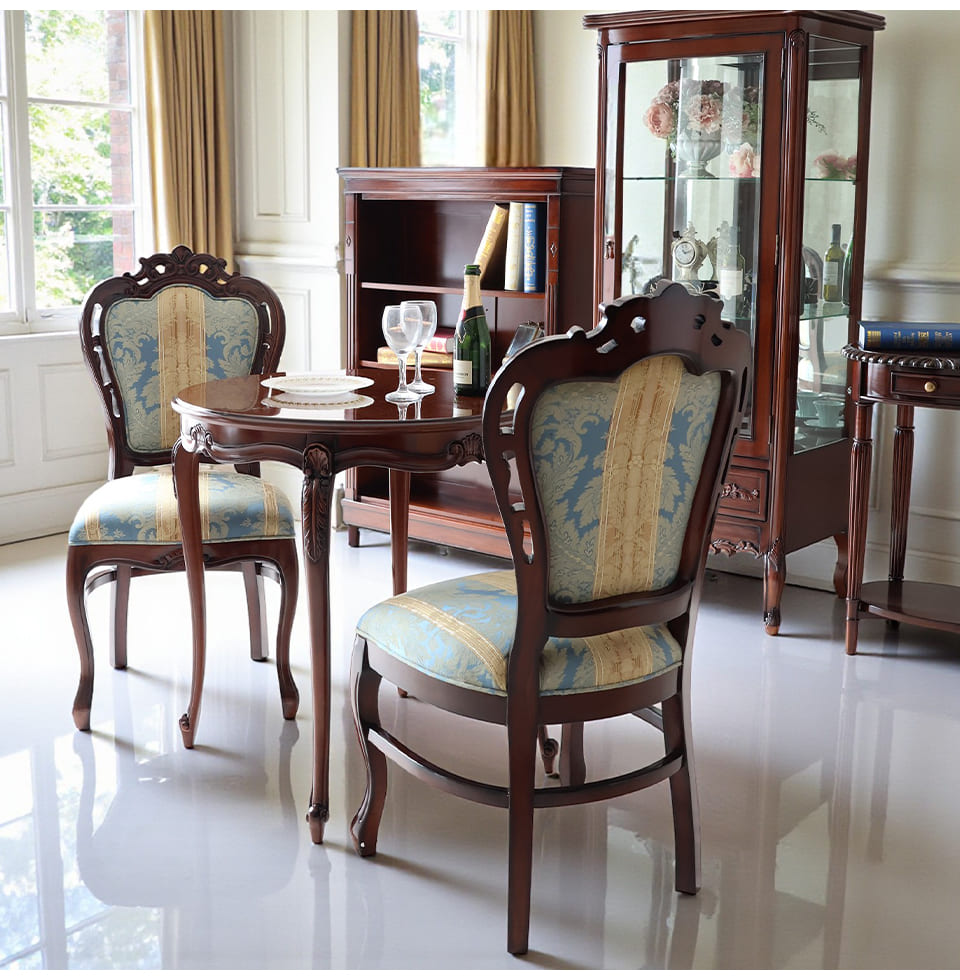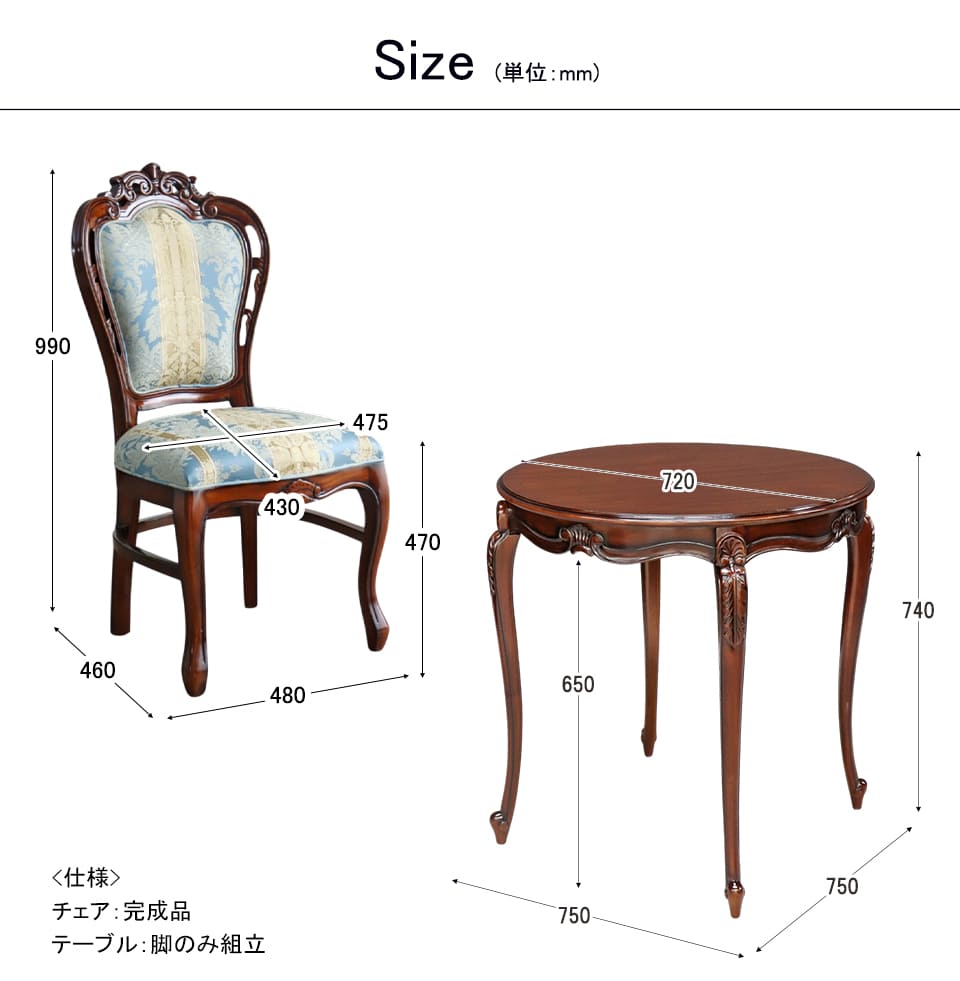 置くだけで、サロンのような佇まい Malina Cassili マリナカッシーリ ヨーロピアン ダイニングセット3P(ブルーストライプ) 2人掛け 限られたスペースでも絵になるクラシック空間が叶う、 マリナカッシーリのヨーロピアンダイニングセット。 直径75cmの丸テーブルは、2人で向かい合っても窮屈にならないほどよい広さ。 角のないフォルムが動線を妨げず、ワンルームや1LDKにもすっきり収まります。 艶やかなマホガニー調ブラウンの天板に、 上品なブルーのチェアが並ぶだけで、日常のワンシーンがサロンのように。 背もたれの優雅な曲線と、鋲打ちのディテールが、 空間にクラシックの格を添えます。 朝のコーヒーも、夜のワインも、自然と丁寧に味わいたくなる。 そんな時間を生み出すダイニングセットです。 ![]() Malina Cassili(マリナカッシーリ) コレクション Malina Cassiliシリーズは、木目が美しいマホガニー材を使用し、艶やかな光沢が魅力。 クラシック&エレガンスな雰囲気のシリーズ。 毎日の毎日の生活を楽しく、豊かにしてくれるシリーズです。 ![]() 小さな空間に、正統派クラシックを 優雅なガブリオールレッグが、空間に確かな存在感をもたらします。 ロマンティックで上品なチェアが艶やかなマホガニー調ブラウンと調和し、 前から見ても、後ろ姿も絵になる佇まい。 ![]() テーブルは直径約75cm、高さ約74cm。 コンパクトでありながら、大人2人が向かい合い、 プレートやグラスをゆったりと並べられる絶妙なサイズ感です。 脚元には、クラシックなガブリオールレッグを採用。 繊細な彫刻のディテールまで丁寧に仕上げ、上品な存在感を漂わせます。 ![]() 差尺は約27cm 差尺27cmのちょうどいいバランス。 テーブルとチェアの高さバランスがしっかり取れているため、 自然な姿勢で食事やティータイムを楽しめます。 膝まわりにもゆとりがあり、立ち座りもスムーズ。 見た目の美しさだけでなく、日常使いの快適さまで考えられた設計です。 ![]() 塗装はウレタン仕上げ ウレタン塗装の最大の特徴は、耐熱性や耐久性に優れていること。 水分も染み込みにくいので、水気にも強く、 軽い汚れ等はさっと拭き取ることができます。 ![]() 小さくても、妥協しないクラシック テーブルは、直径75cmのコンパクト設計。 それでいて、優雅なガブリオールレッグと上品な艶感が、 空間に確かな品格を添えてくれます。 限られたスペースでも、本物志向を楽しめる一台。