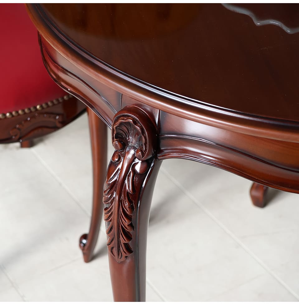天板の上品な光沢に、脚元や幕板へ丁寧に施された繊細な彫刻。 立体感のある装飾が、コンパクトな中にも上品な存在感を添えます。 小さくても、本物志向を楽しめる一台です。
