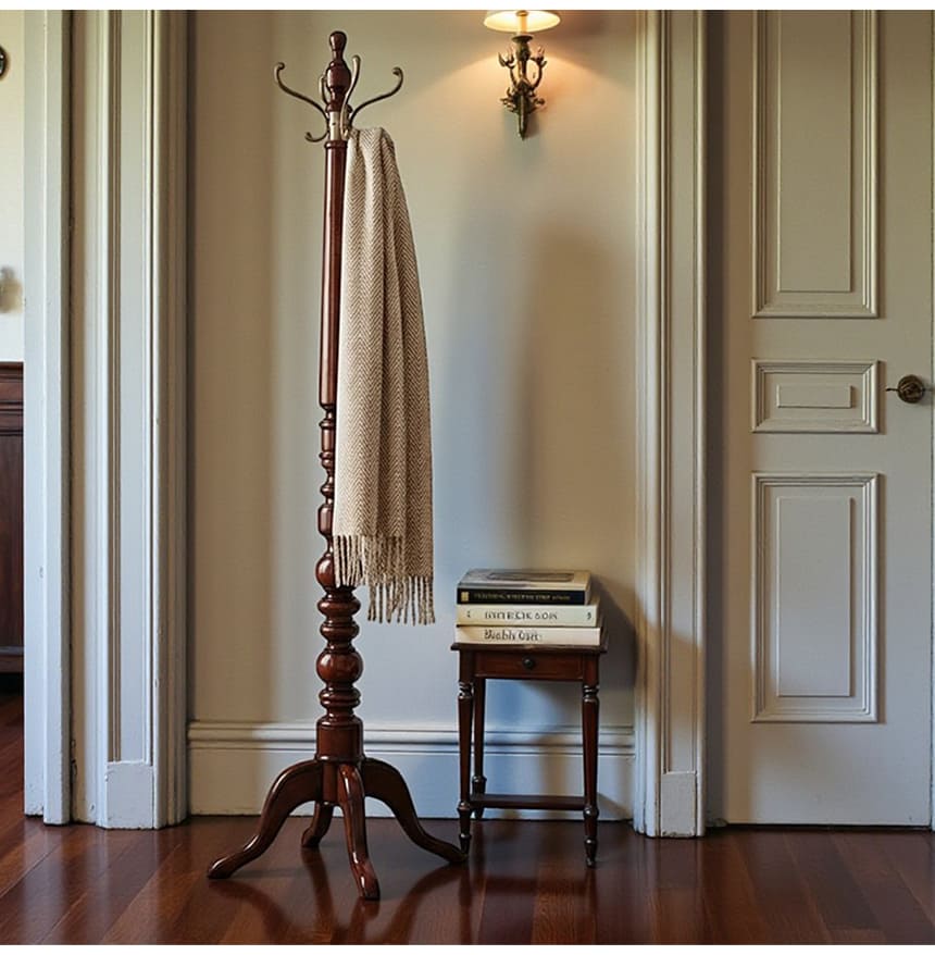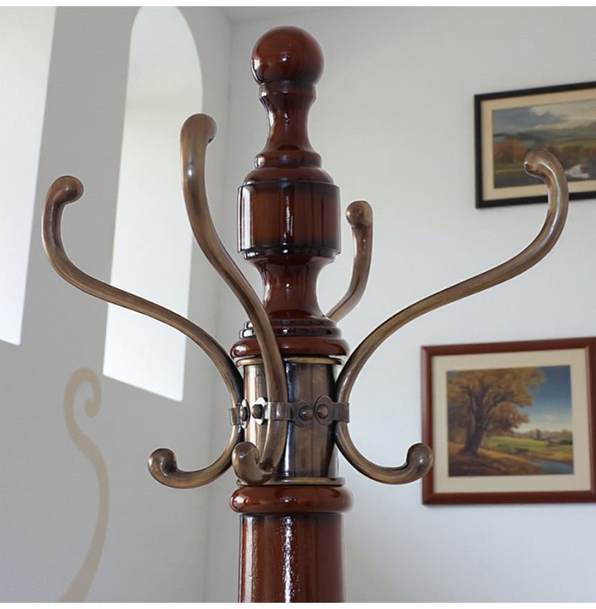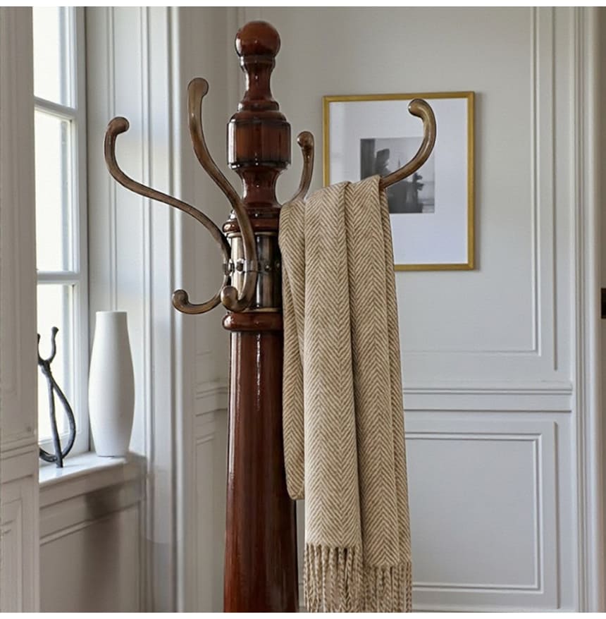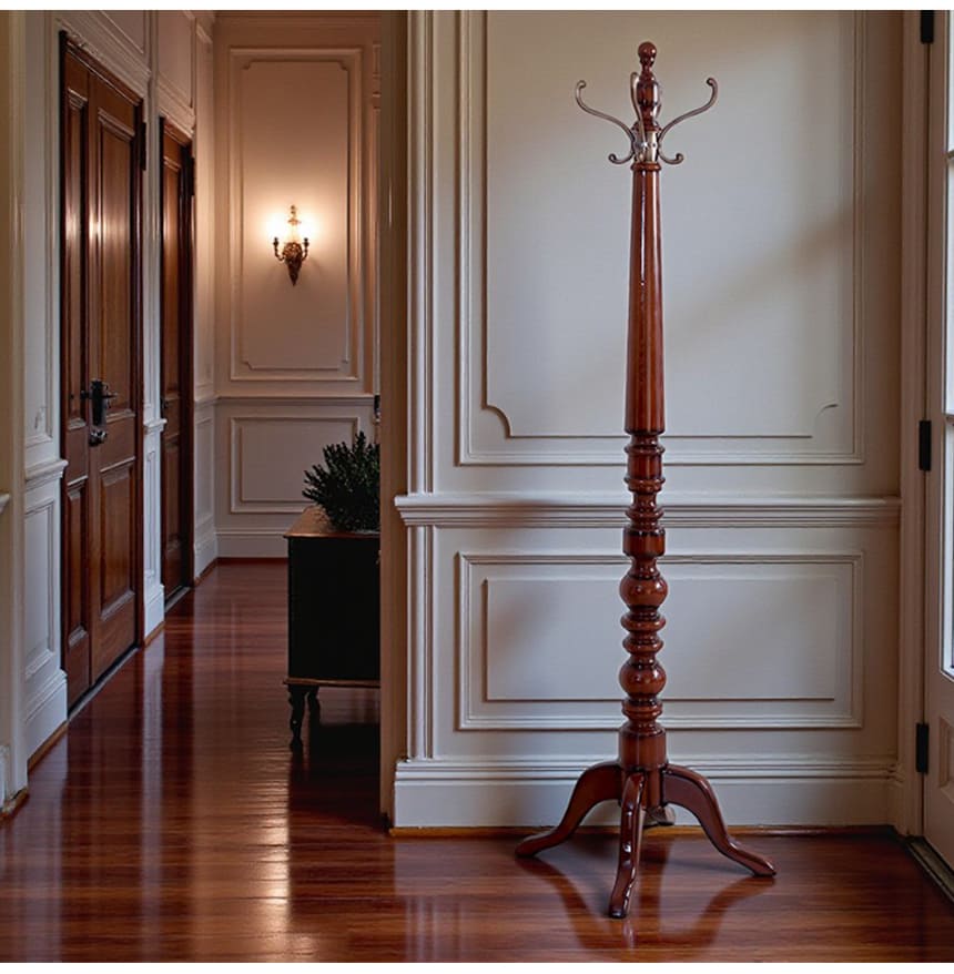 帰宅して最初に目に入る場所だからこそ、玄関にはお気に入りの家具を置きたい。そんな思いに応えてくれるコートハンガーラック。ダークブラウンの艶感が美しいポールと、アンティークゴールドにいぶした真鍮のフックが上品に調和し、掛けるものすべてをディスプレイのように見せてくれます。脚元はエレガントな三つ脚デザインで、安定感と美しさを両立。マリナカッシーリの輸入家具らしいクラシカルなデザインで、貴方の玄関や寝室にホテルライクな雰囲気をもたらします。