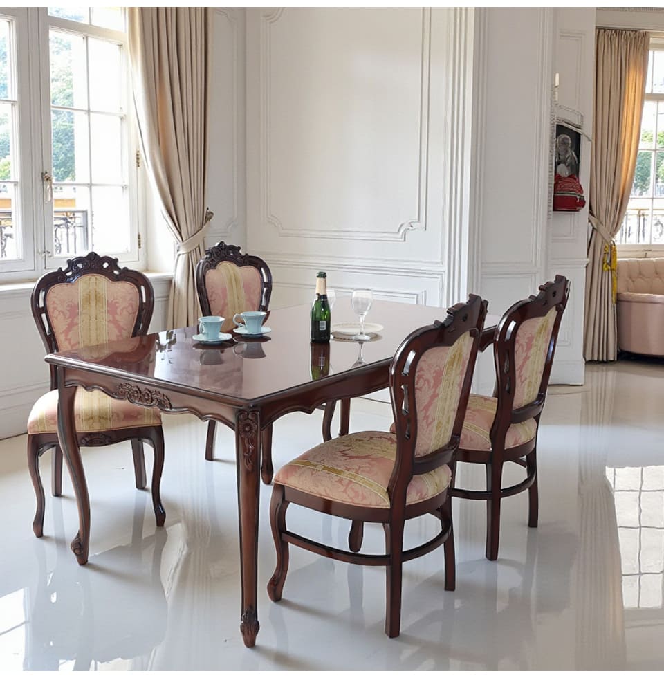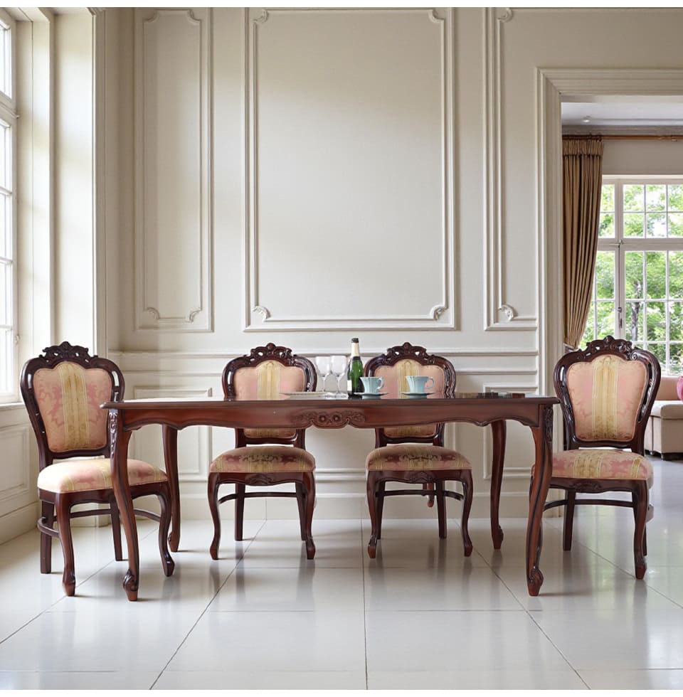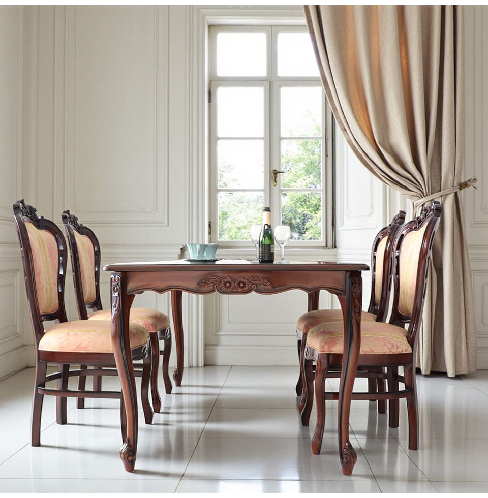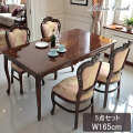 | 製品名: | ヨーロピアン ダイニングセット 5点 4人掛け 幅165cm 長方形 象嵌 マホガニー ピンクストライプチェア アンティーク調 輸入家具 |