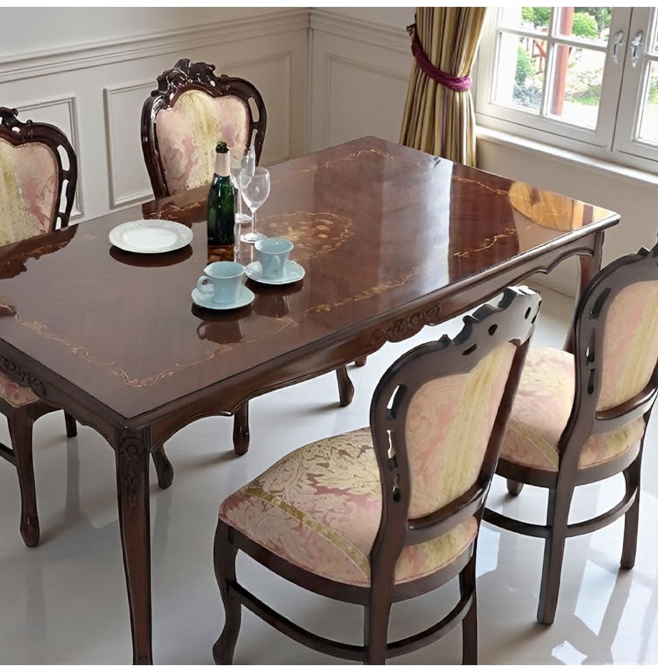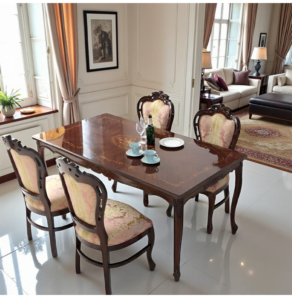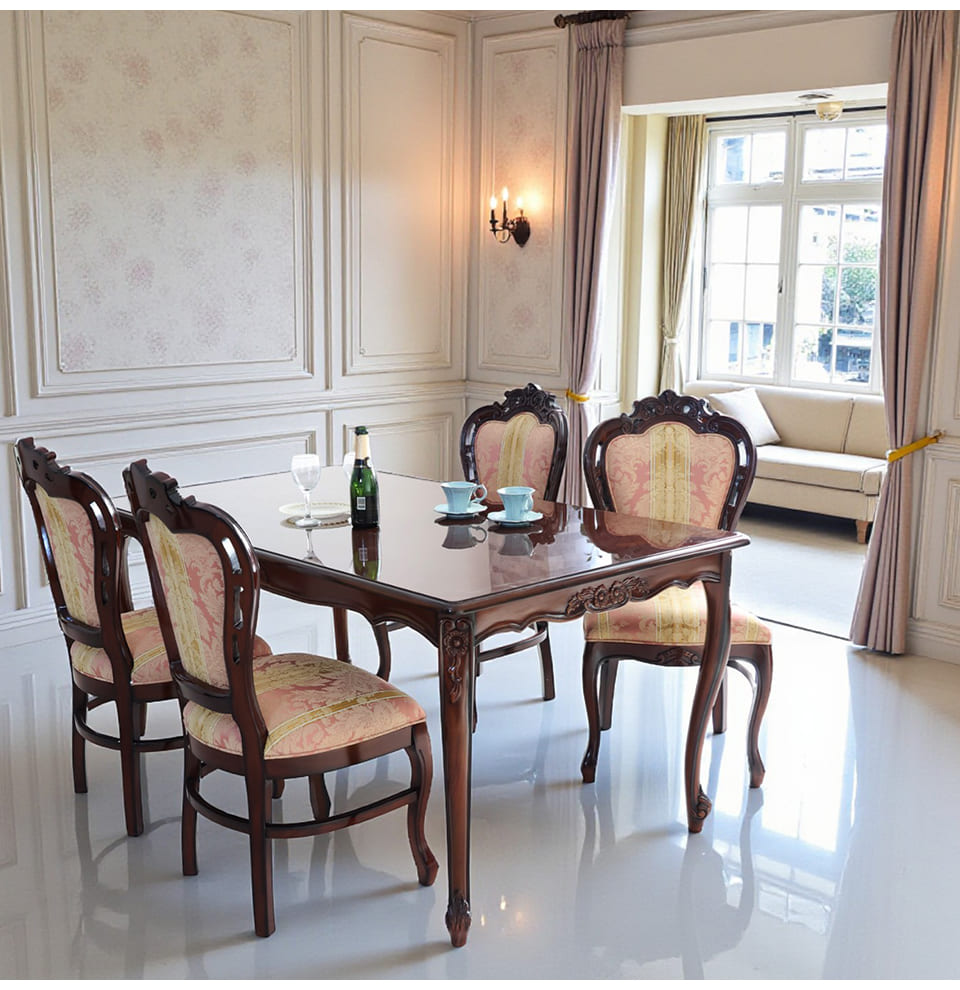 やわらかなピンクストライプと、深みのあるマホガニーのコントラストが印象的な、4人掛けのダイニングセット。幅165cmの長方形テーブルは、プレートやカトラリーをゆったりと並べられるサイズで、日々の食事はもちろん、ゲストを招く来客シーンでも大活躍。 また、天板に施された象嵌は、テーブルクロスを掛けなくても華やかな雰囲気に。チェアはイタリアンスタイルのデザインで、背もたれの湾曲と猫脚がクラシカルな佇まいを演出します。ピンクのストライプ生地は甘くなり過ぎず、暮らしの中にほんの少しロマンティックな空気を運んでくれそう。