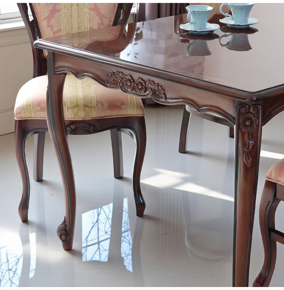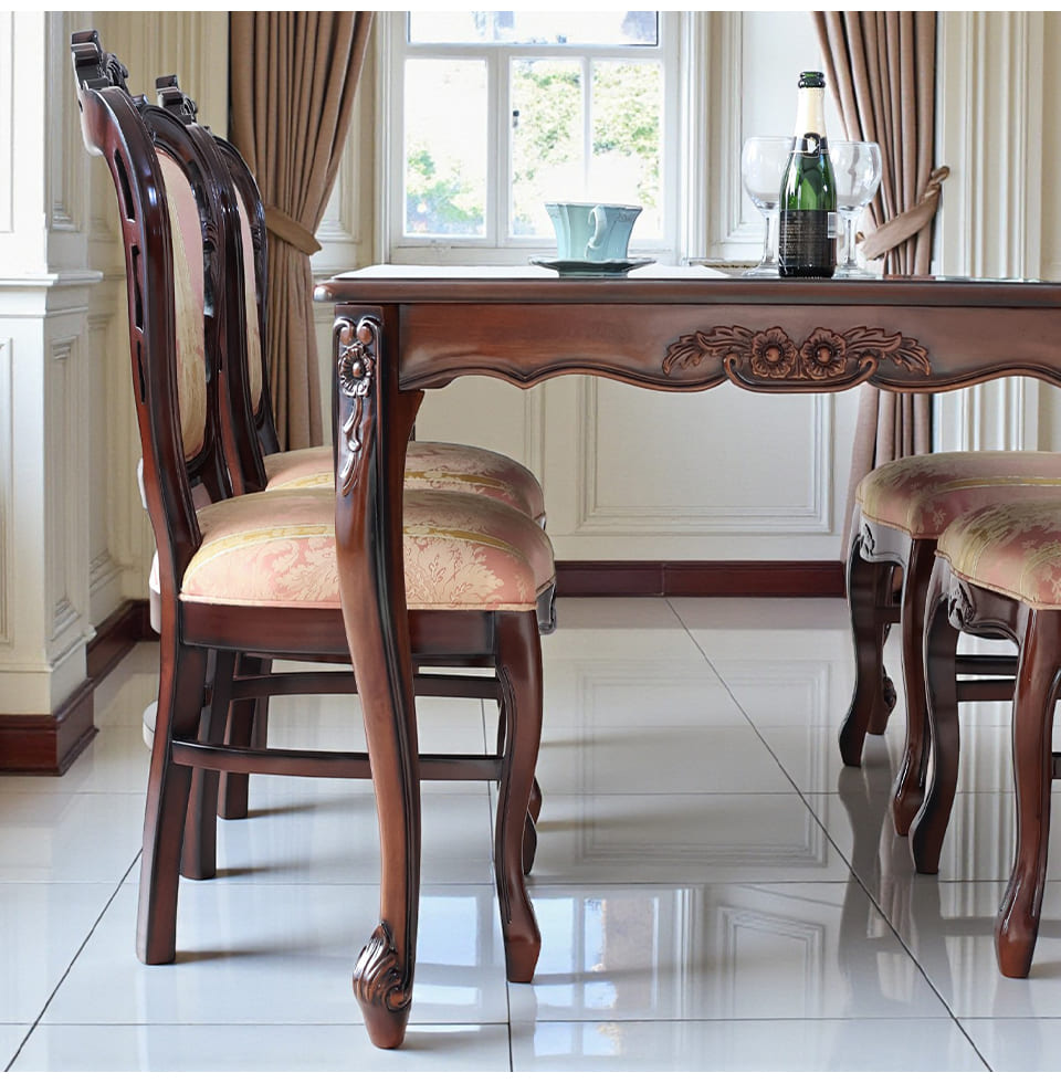 象嵌がきらめくテーブルで、日常の食卓を Malina Cassili マリナカッシーリ ヨーロピアン ダイニングセット5P(ピンクストライプ)4人掛け 迎え入れたその瞬間から、空間にまっすぐな品格が宿る。 マリナカッシーリの165cm4人掛けダイニングセット。 艶やかなマホガニー材の天板は、イタリアデザインの象嵌模様がさりげなく浮かび、 光を受けるたびに深みのある表情を見せます。 直線の美しさが際立つ長方形フォルムは、 4人でゆったりと、6人でもバランスよく囲める安心のサイズ感。 中央に大皿やボトルを並べても余裕があり、端正で整った印象を空間にもたらします。 柔らかで上品なピンクのチェアが並ぶ姿は、前からも後ろ姿も美しく、 繊細な彫刻と優雅な曲線脚がクラシックの気品を静かに語ります。 食事の時間が、自然と丁寧になる。 集うひとときが、少し誇らしくなる。 日常に、正統派クラシックの余韻をもたらすダイニングセットです。 ![]() Malina Cassili(マリナカッシーリ) コレクション Malina Cassiliシリーズは、木目が美しいマホガニー材を使用し、艶やかな光沢が魅力。 クラシック&エレガンスな雰囲気のシリーズ。 毎日の毎日の生活を楽しく、豊かにしてくれるシリーズです。 ![]() 艶めきが、空間の格を決める 光をやわらかく映し込む、艶やかなテーブル。 イタリアデザインの象嵌模様が、さりげなく上質さを語ります。 そこにチェアが美しく並ぶことで、完成されたクラシック空間が実現。 165cmのゆとりあるサイズ感は、4人で囲んでも余裕のある広さ。 日常の食卓を、静かに誇れる場所へと引き上げるダイニングセットです。 ![]() 背面にまで丁寧に施された透かし彫りと、なめらかな曲線で縁取られたフォルム。 後ろ姿までも計算されたデザインだから、 壁付けだけではなく、空間の中央に置いても美しく映えます。 正面だけでなく、どの角度から見ても絵になる佇まいも魅力。 ![]() 差尺は約27cm 差尺27cmのちょうどいいバランス。 テーブルとチェアの高さバランスがしっかり取れているため、 自然な姿勢で食事やティータイムを楽しめます。 膝まわりにもゆとりがあり、立ち座りもスムーズ。 見た目の美しさだけでなく、日常使いの快適さまで考えられた設計です。