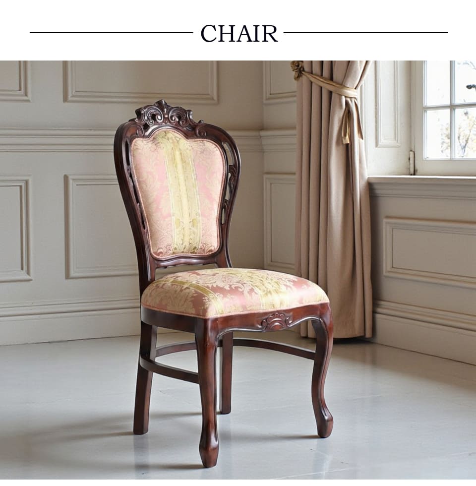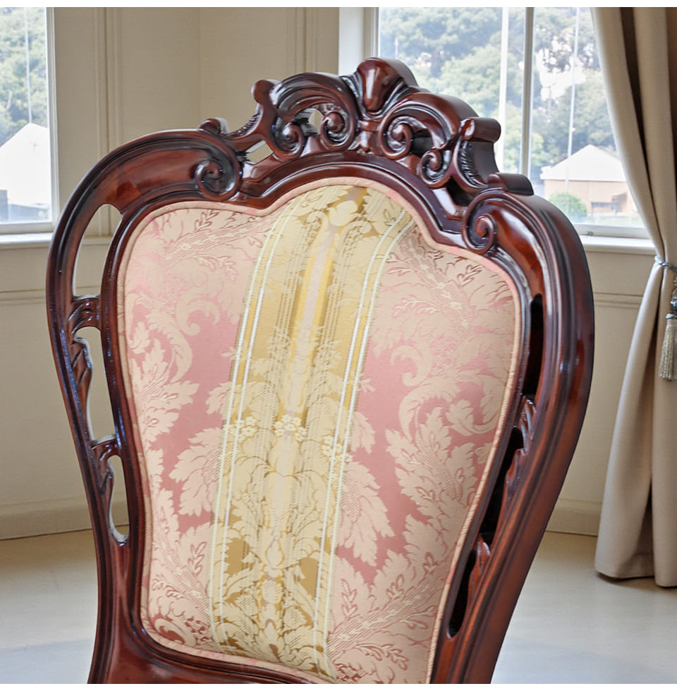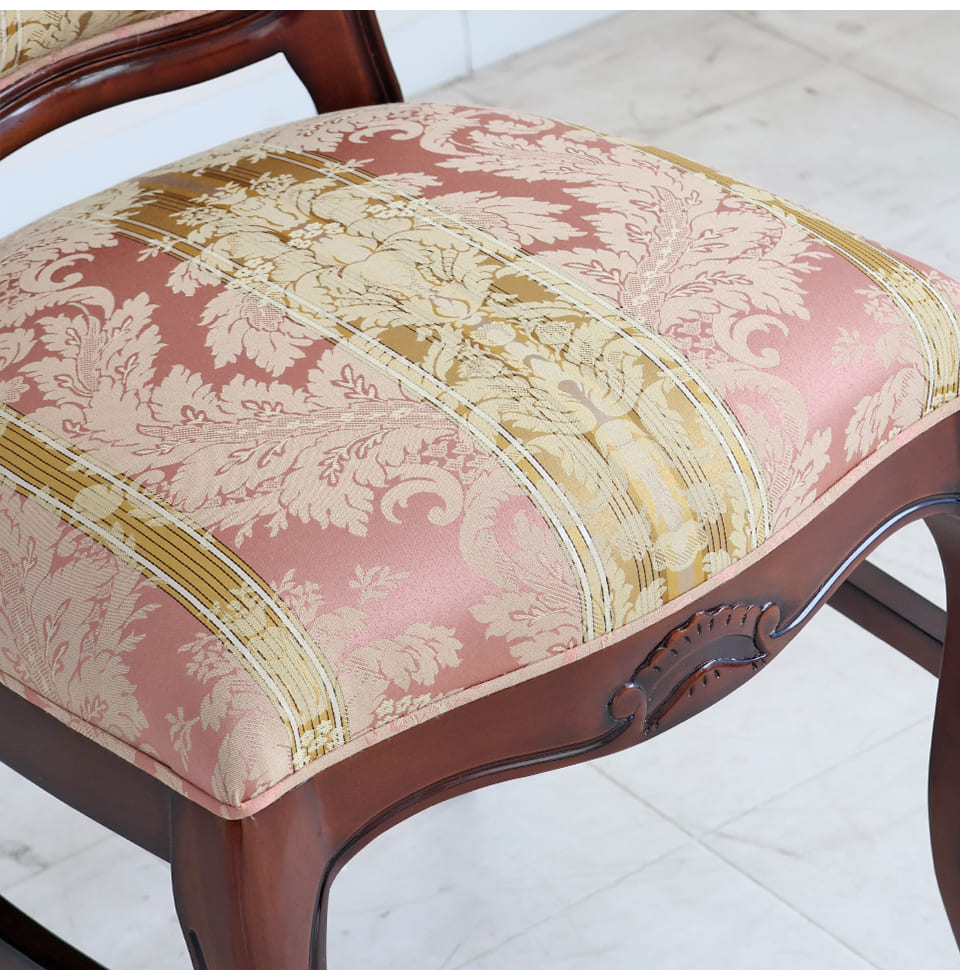 ![]() 主役を張れる一脚 繊細な透かし彫りと、立体感のあるトップ装飾。 やわらかな曲線で縁取られた背もたれが、クラシックの気品を美しく引き立てます。 淡く上品なピンクの張地には、さりげない柄をあしらい、 空間にやわらかな華やぎをプラス。 背もたれは広く、ゆったりと身体を預けられる安心感のあるフォルム。 優雅に伸びる曲線脚が、重厚さの中に軽やかさを添えています。 前から見ても、横から見ても、そして後ろ姿まで絵になる一脚。 空間にそっと気品を宿す、エレガントなクラシックチェアです。