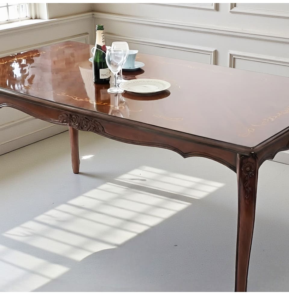 ![]() 塗装はウレタン仕上げ ウレタン塗装の最大の特徴は、耐熱性や耐久性に優れていること。 水分も染み込みにくいので、水気にも強く、 軽い汚れ等はさっと拭き取ることができます。 ![]() 空間の中心に、品格を 幅165cmのゆとりあるテーブルは、4人でゆったり使うのはもちろん、 6人掛けとしても対応できるサイズ設計。 中央に大皿やボトルを置いても余裕があり、 人が集うシーンでも窮屈さを感じさせません。 直線が際立つ端正なフォルムは、空間に整った印象をもたらし、 艶やかなマホガニー材の天板が光を美しく映し込みます。 ただ人を座らせるためのテーブルではなく、 集う時間そのものを上質に整えてくれる。そんなテーブルです。