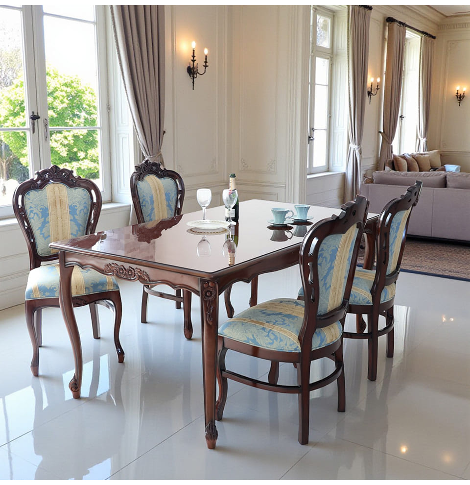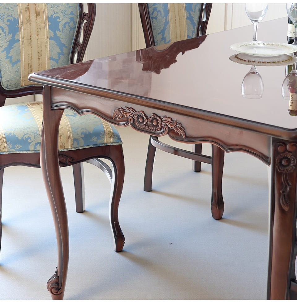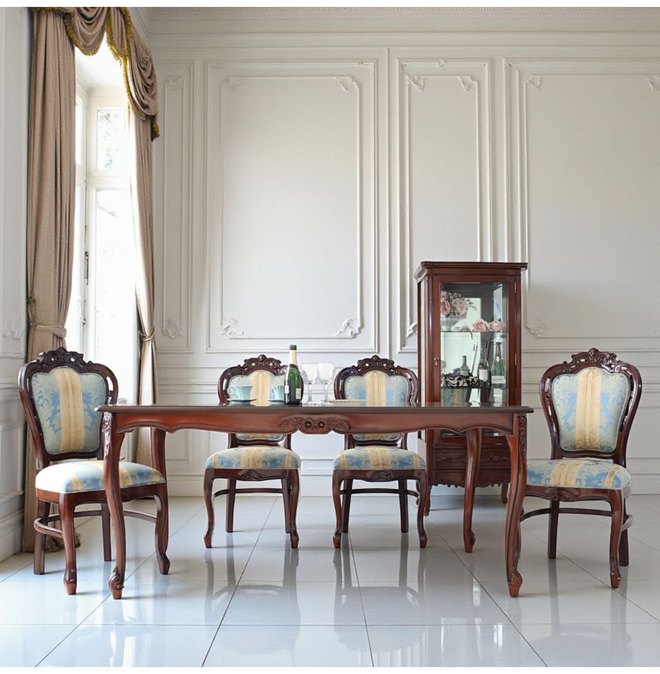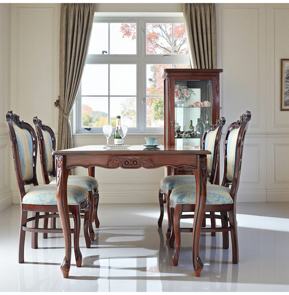 落ち着いたマホガニーのブラウンに、爽やかなブルーストライプが映える4人掛けのダイニングセット。幅165cmの長方形テーブルは、お料理やグラスをゆったりと並べられるサイズ感で、日々の食卓から来客時のディナーまで幅広く活躍します。天板に施された象嵌は、テーブルクロスがなくても絵になる存在感。チェアはイタリアンスタイルのデザインで、フレームの彫刻と猫脚がクラシカルな雰囲気を高めます。ブルーストライプ生地は甘さを抑えた上品なカラーで、和洋どちらのインテリアにもなじむ輸入家具です。
