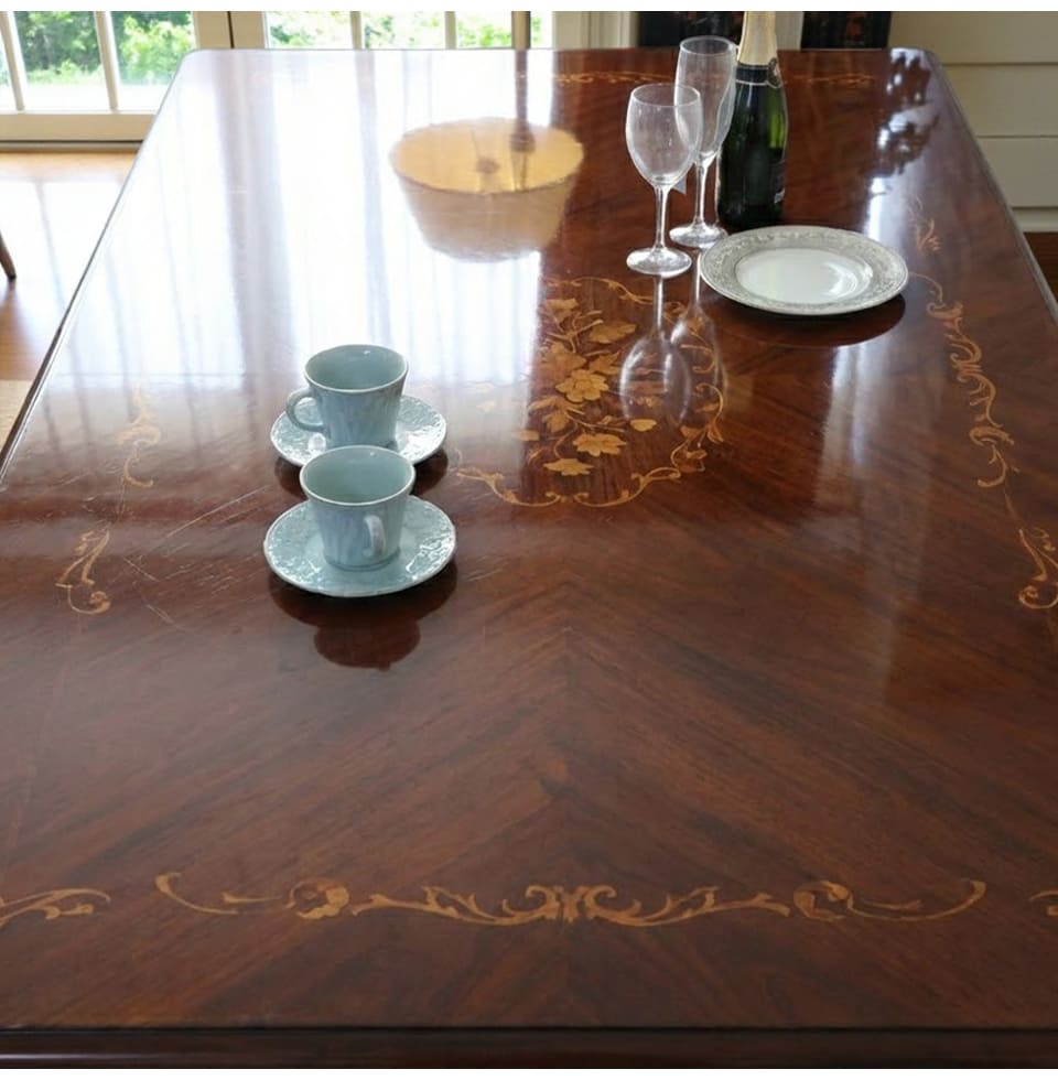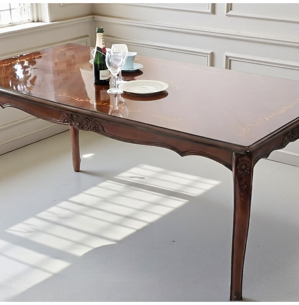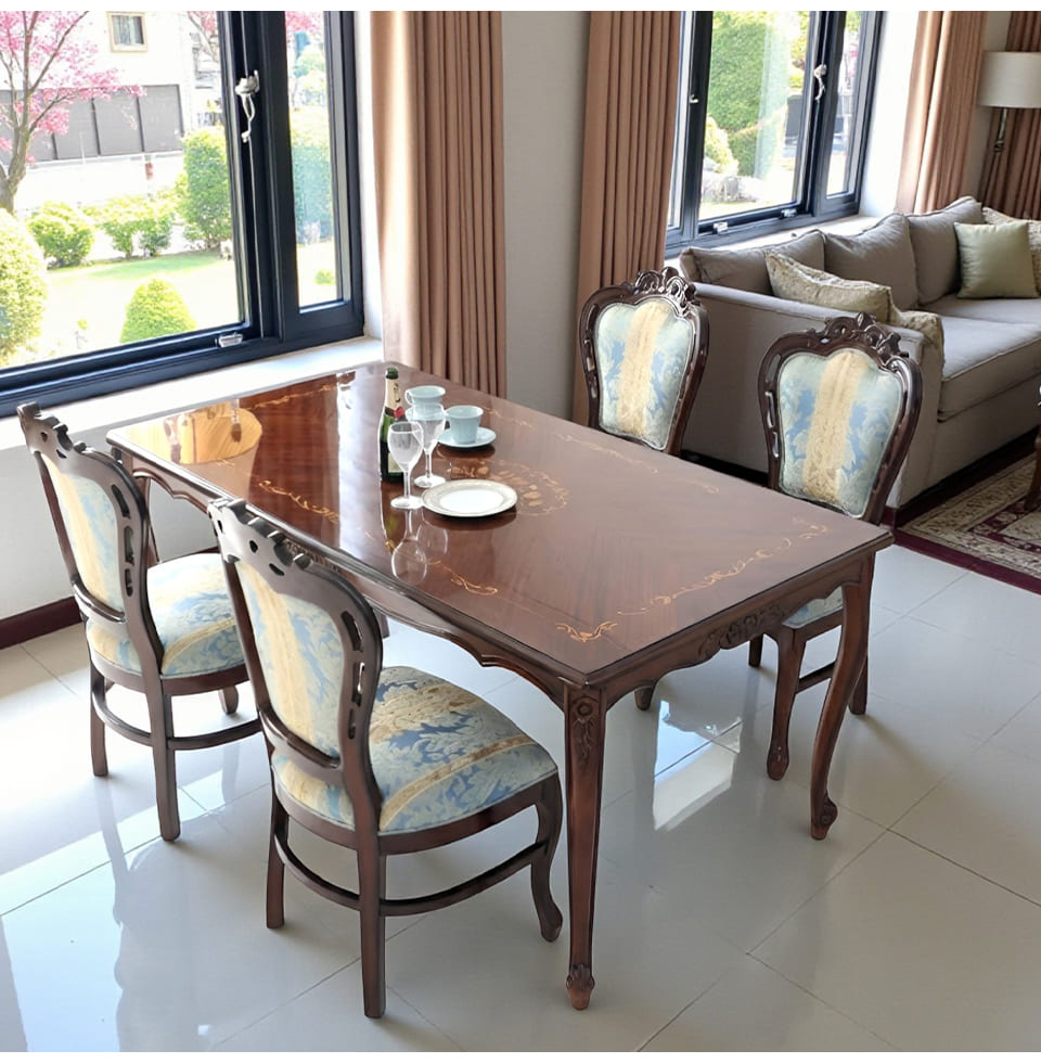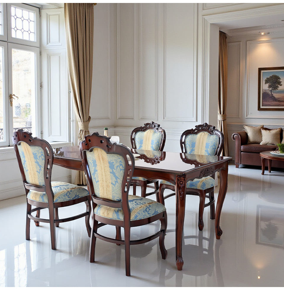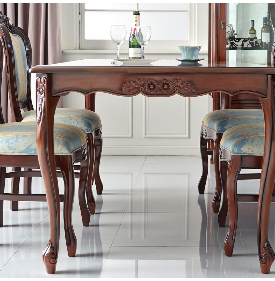 落ち着いたマホガニーのブラウンに、爽やかなブルーストライプが映える4人掛けのダイニングセット。幅165cmの長方形テーブルは、お料理やグラスをゆったりと並べられるサイズ感で、日々の食卓から来客時のディナーまで幅広く活躍します。天板に施された象嵌は、テーブルクロスがなくても絵になる存在感。チェアはイタリアンスタイルのデザインで、フレームの彫刻と猫脚がクラシカルな雰囲気を高めます。ブルーストライプ生地は甘さを抑えた上品なカラーで、和洋どちらのインテリアにもなじむ輸入家具です。