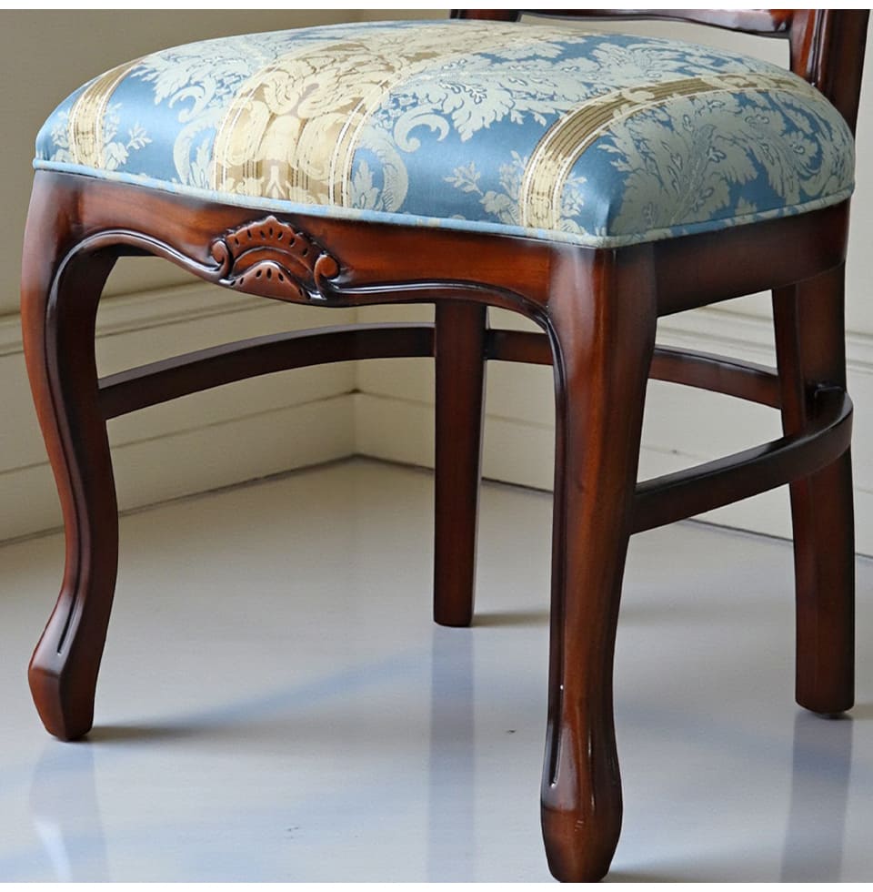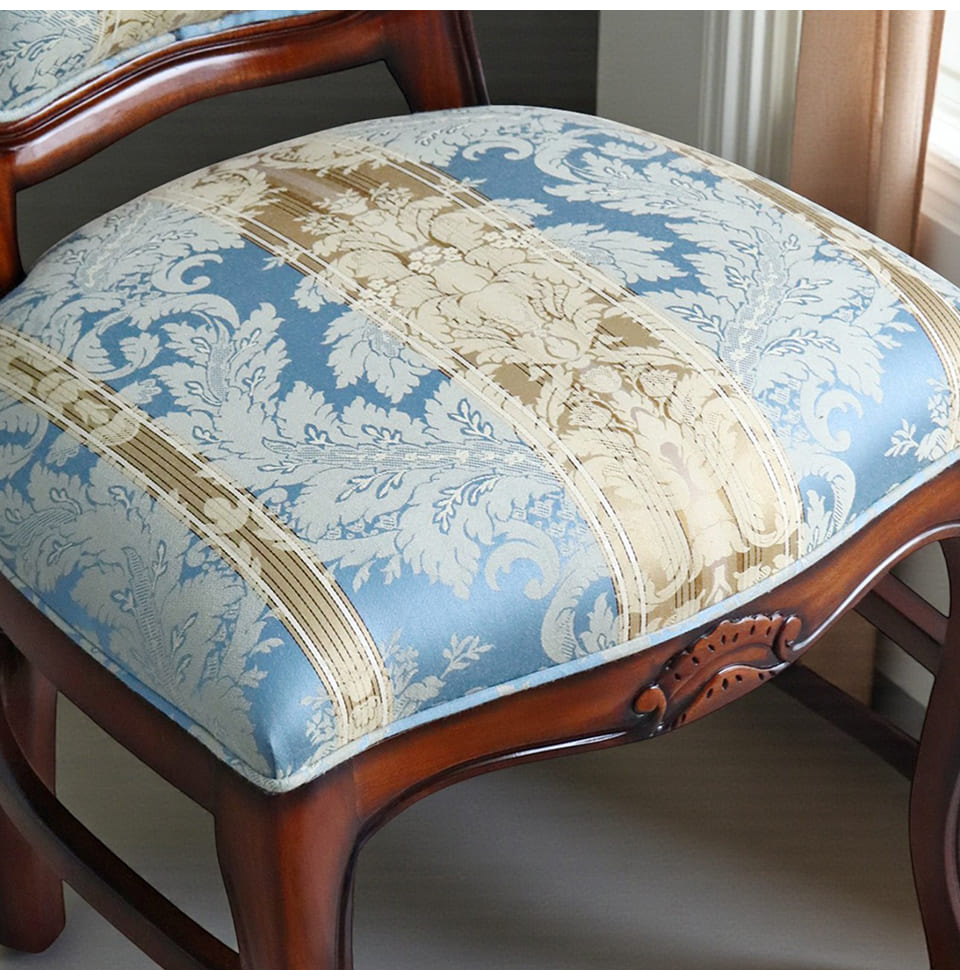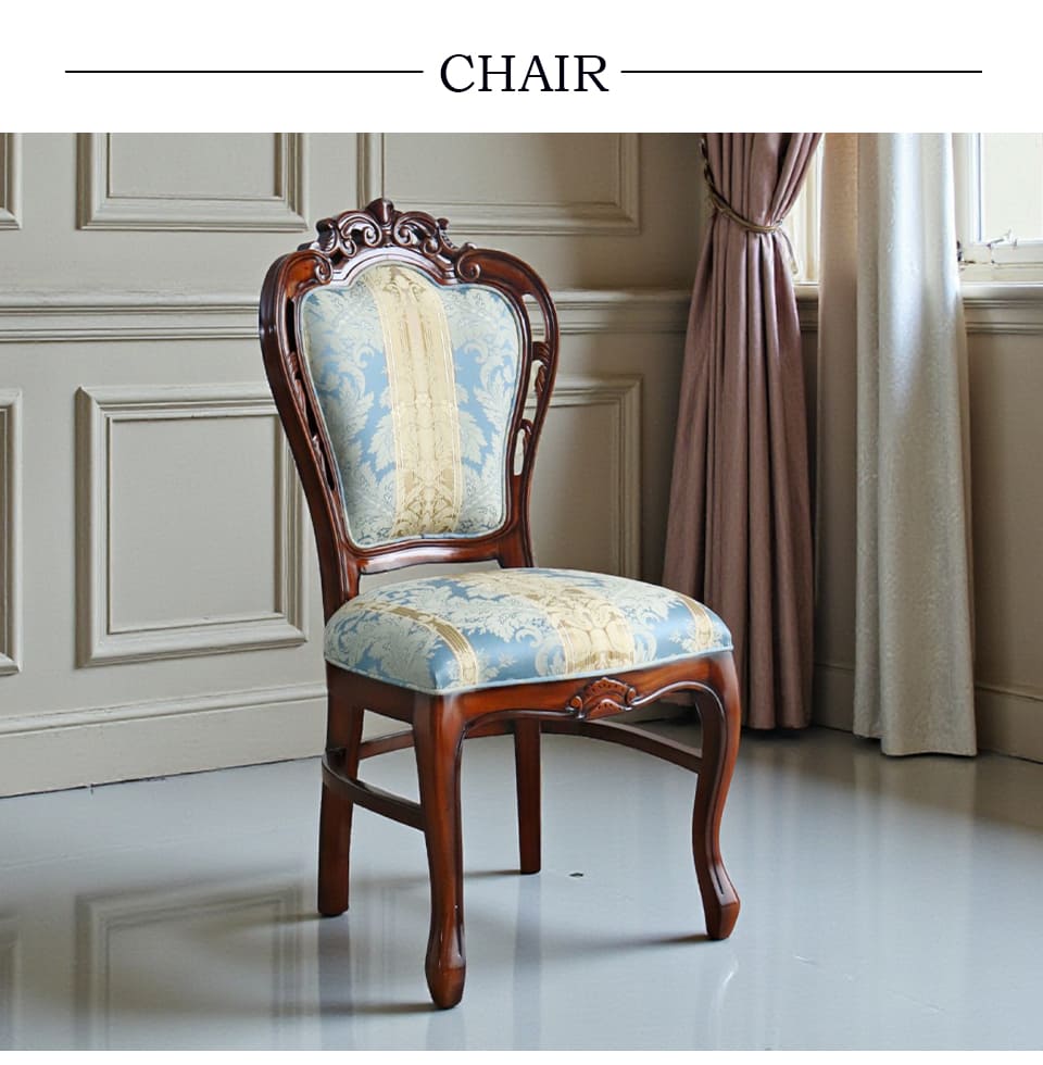 ![]() 主役を張れる一脚 繊細な透かし彫りと、立体感のあるトップ装飾。 やわらかな曲線で縁取られた背もたれが、クラシックの気品を美しく引き立てます。 淡く上品なブルーの張地には、さりげない柄をあしらい、 空間にやわらかな華やぎをプラス。 背もたれは広く、ゆったりと身体を預けられる安心感のあるフォルム。 優雅に伸びる曲線脚が、重厚さの中に軽やかさを添えています。 前から見ても、横から見ても、そして後ろ姿まで絵になる一脚。 空間にそっと気品を宿す、エレガントなクラシックチェアです。