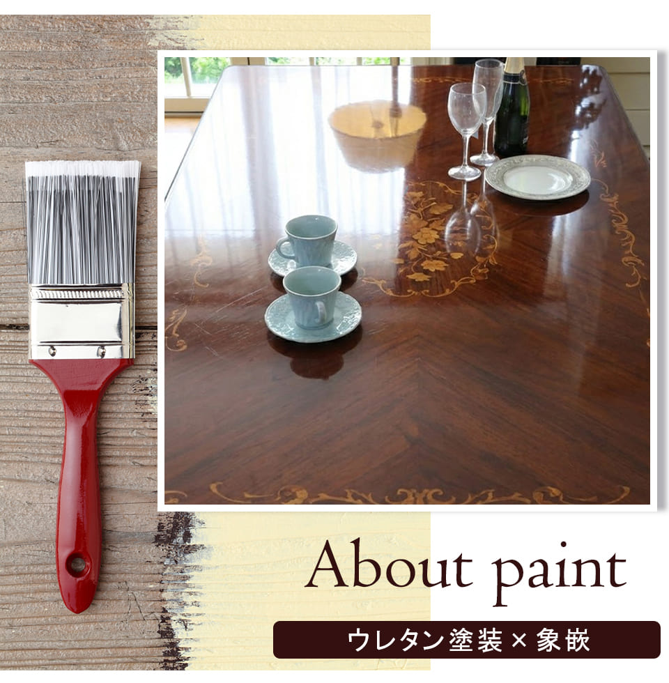 ![]() 塗装はウレタン仕上げ ウレタン塗装の最大の特徴は、耐熱性や耐久性に優れていること。 水分も染み込みにくいので、水気にも強く、 軽い汚れ等はさっと拭き取ることができます。 ![]() 空間の中心に、品格を 幅165cmのゆとりあるテーブルは、4人でゆったり使うのはもちろん、 6人掛けとしても対応できるサイズ設計。 中央に大皿やボトルを置いても余裕があり、 人が集うシーンでも窮屈さを感じさせません。 直線が際立つ端正なフォルムは、空間に整った印象をもたらし、 艶やかなマホガニー材の天板が光を美しく映し込みます。 ただ人を座らせるためのテーブルではなく、 集う時間そのものを上質に整えてくれる。そんなテーブルです。
