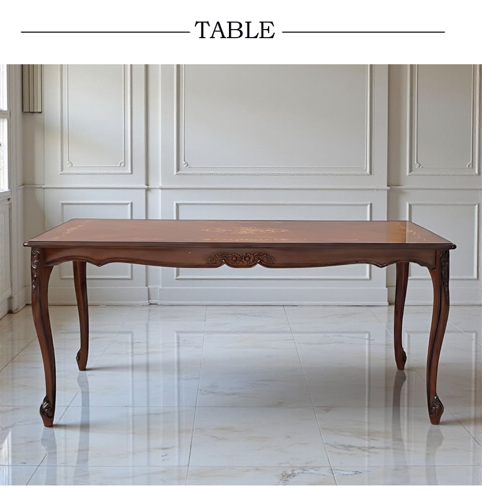 象嵌がきらめくテーブルで、日常の食卓を Malina Cassili マリナカッシーリ ヨーロピアン ダイニングセット5P(ブルーストライプ)4人掛け 迎え入れたその瞬間から、空間にまっすぐな品格が宿る。 マリナカッシーリの165cm4人掛けダイニングセット。 艶やかなマホガニー材の天板は、イタリアデザインの象嵌模様がさりげなく浮かび、 光を受けるたびに深みのある表情を見せます。 直線の美しさが際立つ長方形フォルムは、 4人でゆったりと、6人でもバランスよく囲める安心のサイズ感。 中央に大皿やボトルを並べても余裕があり、端正で整った印象を空間にもたらします。 柔らかで上品なブルーのチェアが並ぶ姿は、前からも後ろ姿も美しく、 繊細な彫刻と優雅な曲線脚がクラシックの気品を静かに語ります。 食事の時間が、自然と丁寧になる。 集うひとときが、少し誇らしくなる。 日常に、正統派クラシックの余韻をもたらすダイニングセットです。 ![]() Malina Cassili(マリナカッシーリ) コレクション Malina Cassiliシリーズは、木目が美しいマホガニー材を使用し、艶やかな光沢が魅力。 クラシック&エレガンスな雰囲気のシリーズ。 毎日の毎日の生活を楽しく、豊かにしてくれるシリーズです。 ![]() 艶めきが、空間の格を決める 光をやわらかく映し込む、艶やかなテーブル。 イタリアデザインの象嵌模様が、さりげなく上質さを語ります。 そこにチェアが美しく並ぶことで、完成されたクラシック空間が実現。 165cmのゆとりあるサイズ感は、4人で囲んでも余裕のある広さ。 日常の食卓を、静かに誇れる場所へと引き上げるダイニングセットです。 ![]() 背面にまで丁寧に施された透かし彫りと、なめらかな曲線で縁取られたフォルム。 後ろ姿までも計算されたデザインだから、 壁付けだけではなく、空間の中央に置いても美しく映えます。 正面だけでなく、どの角度から見ても絵になる佇まいも魅力。 ![]() 差尺は約27cm 差尺27cmのちょうどいいバランス。 テーブルとチェアの高さバランスがしっかり取れているため、 自然な姿勢で食事やティータイムを楽しめます。 膝まわりにもゆとりがあり、立ち座りもスムーズ。 見た目の美しさだけでなく、日常使いの快適さまで考えられた設計です。