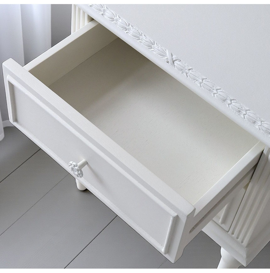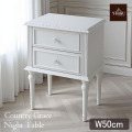 フレンチテイストの白家具「カントリーグレース」シリーズから、幅50cmのナイトテーブルが登場。ホワイト塗装にシャビーな加工を施し、空間に温もりと気品を与えます。幅50cmのちょうどいいサイズ感で、ベッド横やソファ横にも最適。2段の引き出しは、日用品やリモコン、読みかけの本などをすっきり収納するのにもちょうどいい大きさ。ホワイトインテリアや輸入家具好きの方にぴったりの一台です。