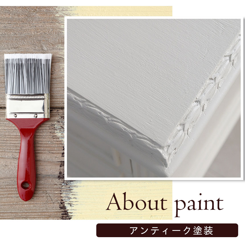 ![]() 塗装はアンティーク塗装でシャビーに 刷毛目をあえて残すことで生まれる、表情豊かなアンティーク塗装。 均一でない塗りの風合いが、まるで長年愛用してきたかのような温もりを漂わせます。 フレンチテイストの空間に、深みと個性を添える仕上げです。 ![]()