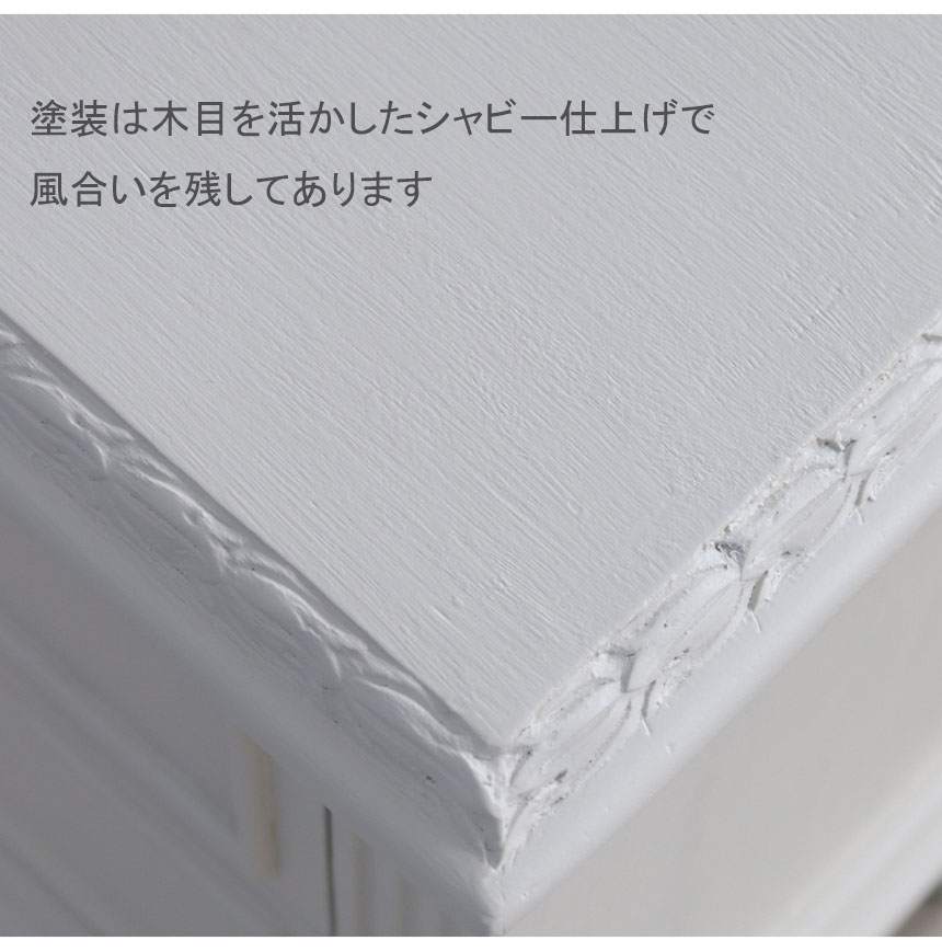 | ご確認ください | ※こちらの商品は海外での生産となります。 ※アンティークな仕上げを意識して作られております。 また、ほとんどが手作り・手塗装で制作されております。 ※一点一点が手作業のため、塗装・仕上がりには個体差がございます。 ※輸入家具の性質上、多少の色ムラ・小傷・塗装のムラなどが見受けられますこと予めご理解・ご了承くださいませ。 ※木の節などがある場合がございます。 天然木を使用しておりますため、ご理解くださいませ。 |