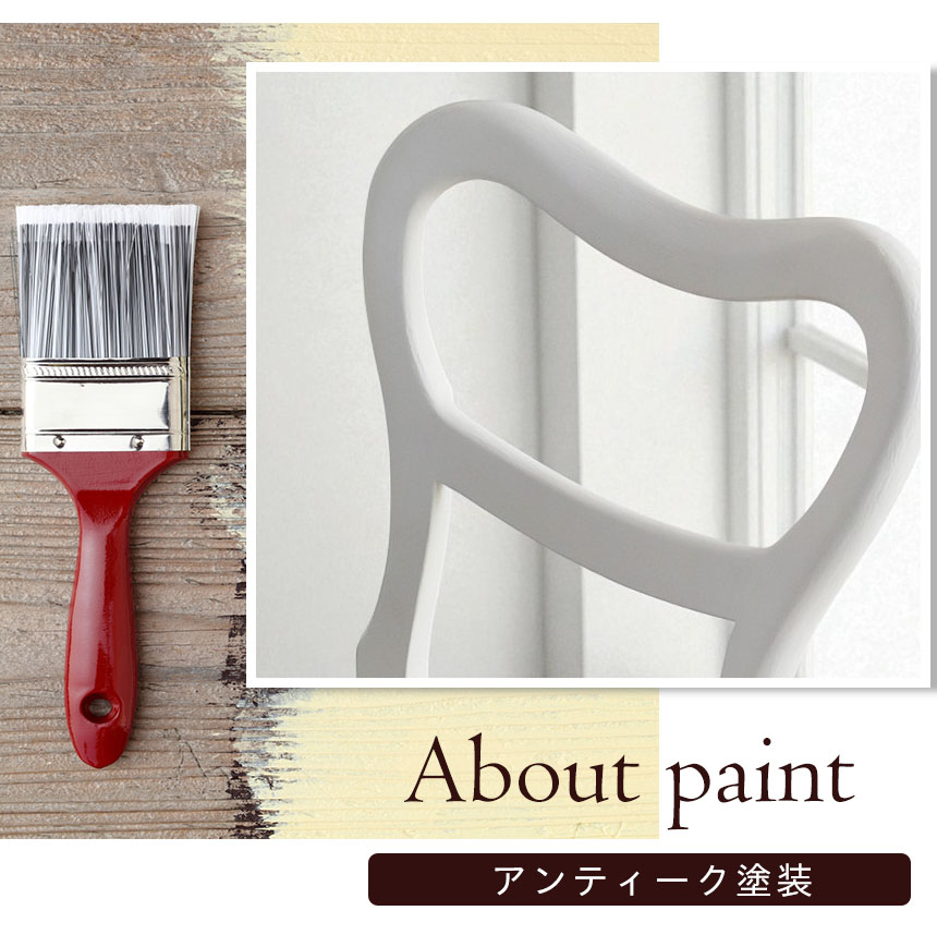 ![]() 塗装はアンティーク塗装でシャビーに 刷毛目をあえて残すことで生まれる、表情豊かなアンティーク塗装。 均一でない塗りの風合いが、まるで長年愛用してきたかのような温もりを漂わせます。 フレンチテイストの空間に、深みと個性を添える仕上げです。