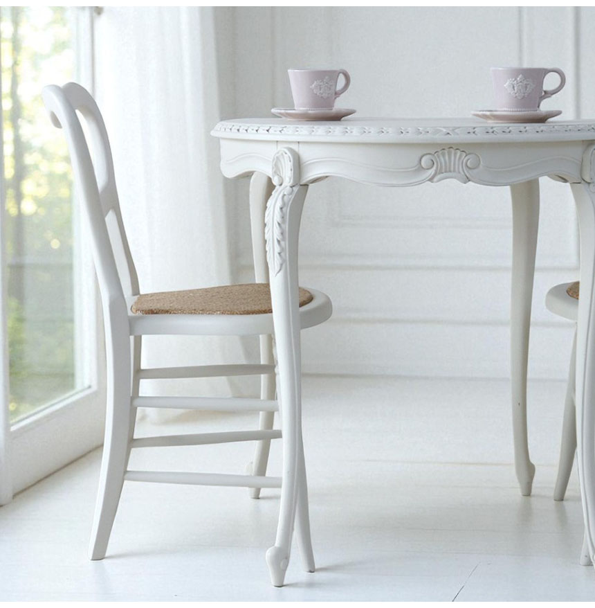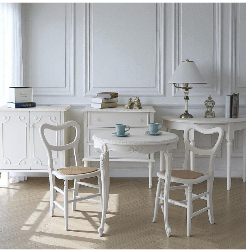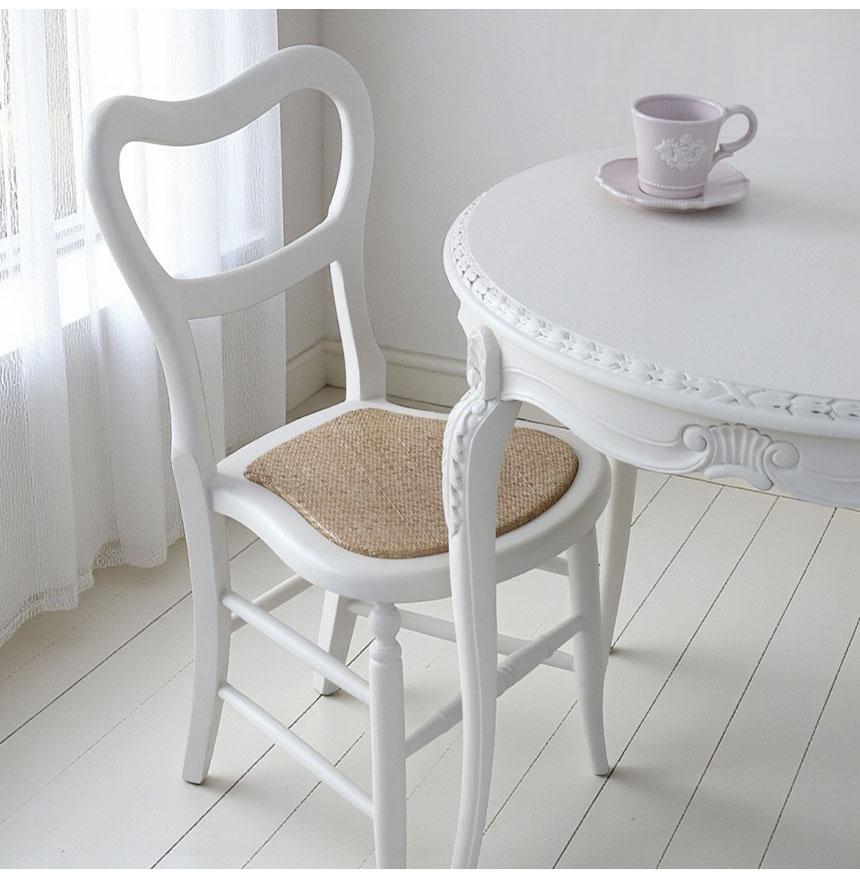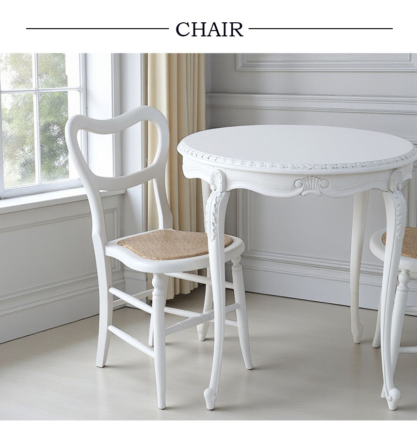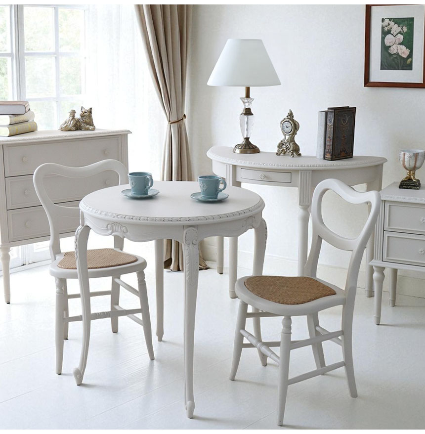 まるでパリのカフェを切り取ったような、優雅でおしゃれなダイニングセット。幅78cmのコンパクトなラウンドテーブルと、ホワイト塗装の猫脚が印象的。チェアの座面はラタン素材にハードウレタンを入れ、軽やかで快適な座り心地に仕上げました。省スペースでも置きやすく、朝食やティータイムにもぴったり。フレンチテイストとシャビーシックが融合したデザインで、お部屋をワンランク上の空間へと変えてくれます。 シリーズ家具と組み合わせれば、統一感のあるおしゃれな空間をお楽しみいただけます。