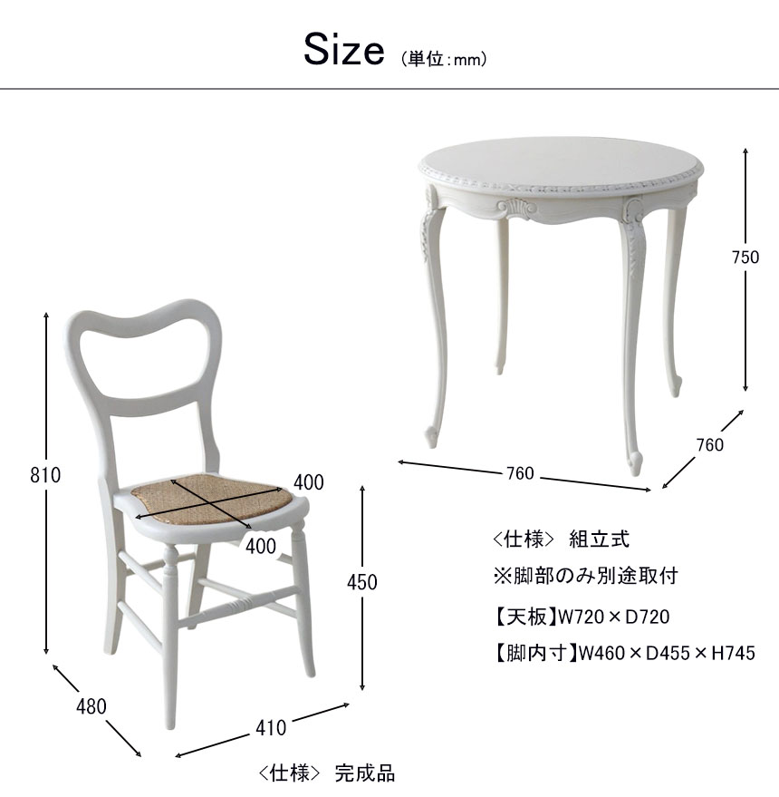 | 仕様 | ■テーブル:脚は取り外し式 ■チェア:完成品 |